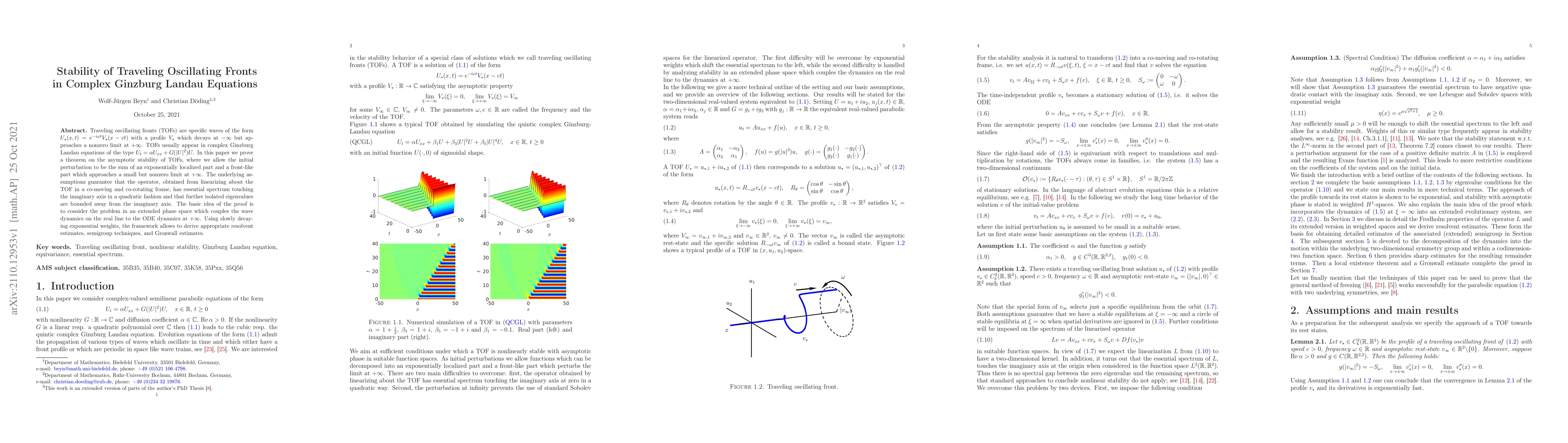 This paper proves that traveling oscillating fronts in complex Ginzburg Landau equations are asymptotically stable under certain conditions, allowing for initial perturbations to approach a small but nonzero limit at infinity.
