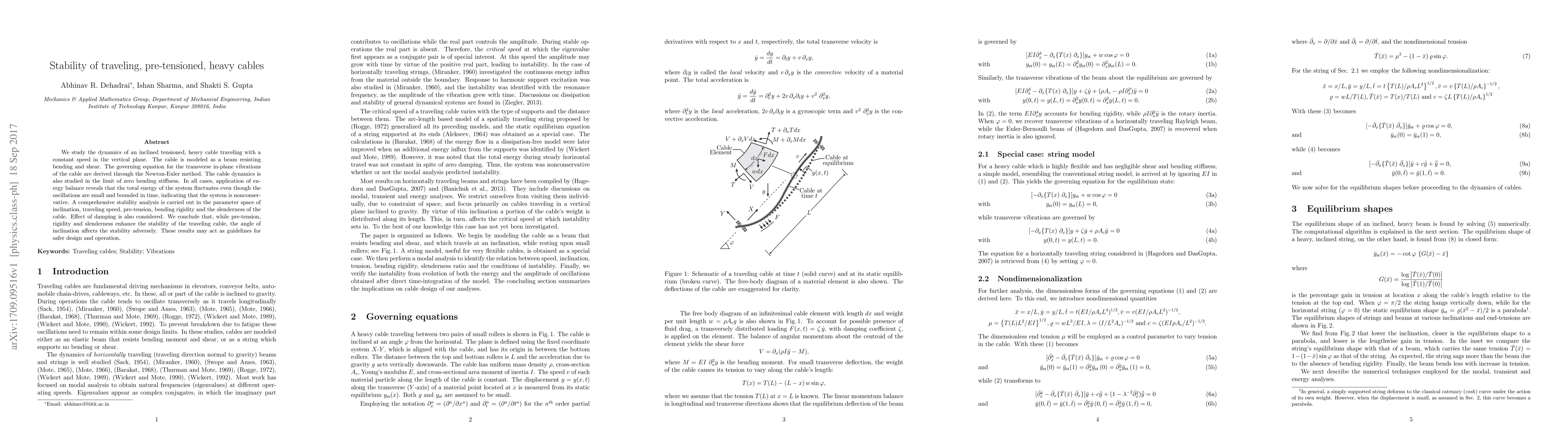 We study the dynamics of an inclined tensioned, heavy cable traveling with a constant speed in the vertical plane. The cable is modeled as a beam resisting bending and shear. The governing equation for the transverse in-plane vibrations of the cable are derived through the Newton-Euler method. The cable dynamics is also studied in the limit of zero bending stiffness. In all cases, application of en- ergy balance reveals that the total energy of the system fluctuates even though the oscillations are small and bounded in time, indicating that the system is nonconser- vative. A comprehensive stability analysis is carried out in the parameter space of inclination, traveling speed, pre-tension, bending rigidity and the slenderness of the cable. Effect of damping is also considered. We conclude that, while pre-tension, rigidity and slenderness enhance the stability of the traveling cable, the angle of inclination affects the stability adversely. These results may act as guidelines for safer design and operation.