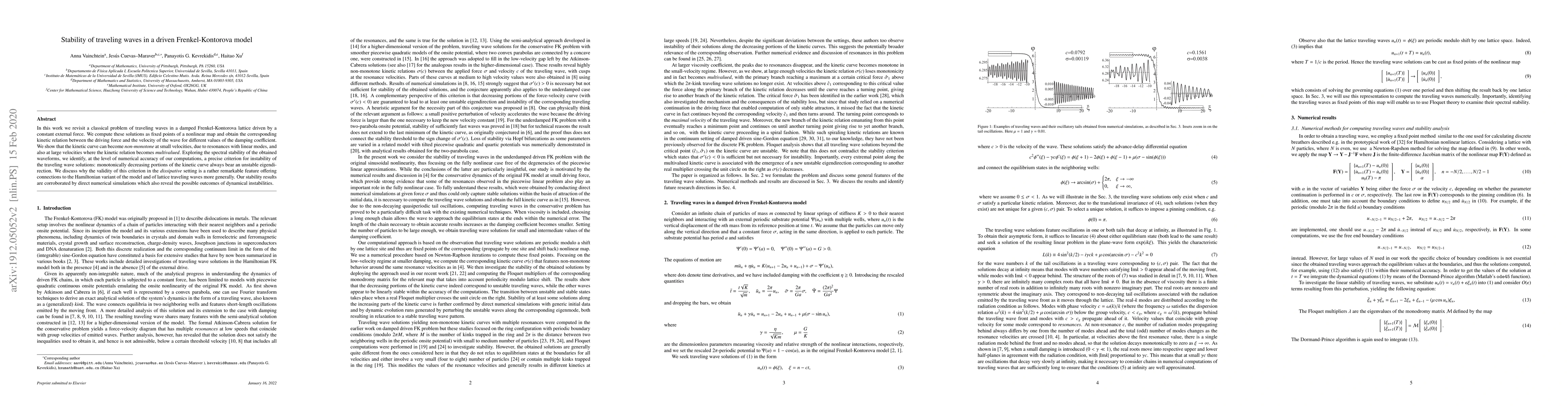 This paper investigates traveling waves in a driven Frenkel-Kontorova model, deriving kinetic relations between driving force and wave velocity. It reveals non-monotonic kinetic curves and identifies spectral stability criteria for wave solutions, showing that unstable eigendirections correlate with decreasing portions of the kinetic curve.