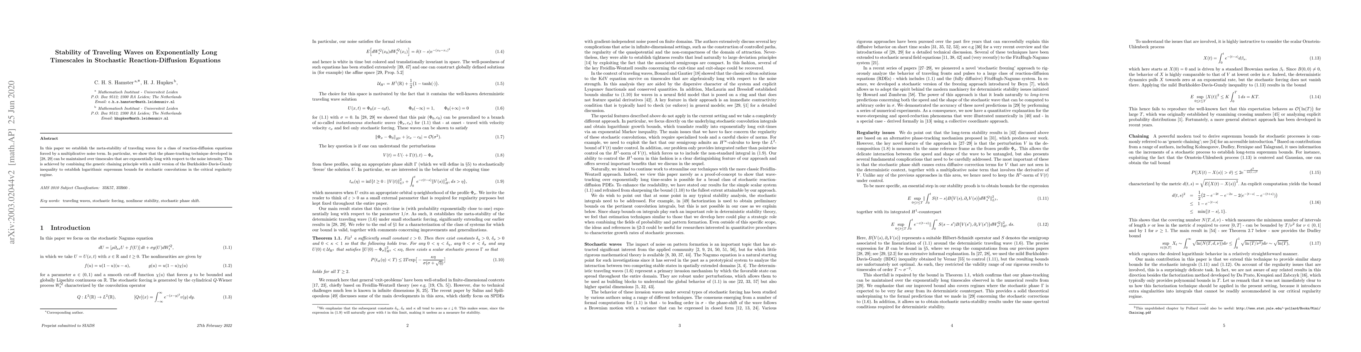 In this paper we establish the meta-stability of travelling waves for a class of reaction-diffusion equations forced by a multiplicative noise term. In particular, we show that the phase-tracking technique developed in [hamster2017,hamster2020] can be maintained over timescales that are exponentially long with respect to the noise intensity. This is achieved by combining the generic chaining principle with a mild version of the Burkholder-Davis-Gundy inequality to establish logarithmic supremum bounds for stochastic convolutions in the critical regularity regime.