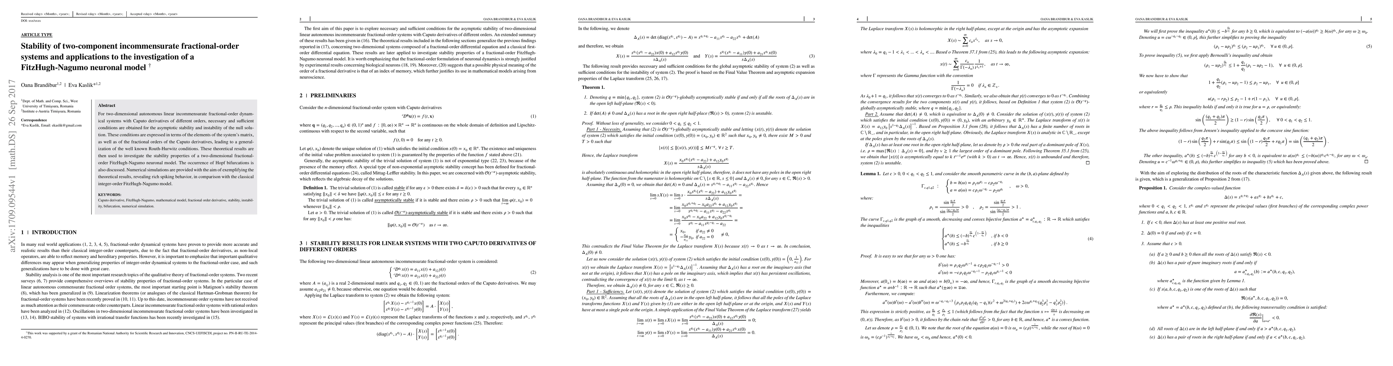 This paper establishes necessary and sufficient conditions for the stability of two-dimensional incommensurate fractional-order systems, generalizing the Routh-Hurwitz criteria. It applies these conditions to analyze the stability and dynamics of a fractional-order FitzHugh-Nagumo neuronal model, revealing complex spiking behaviors and Hopf bifurcations.