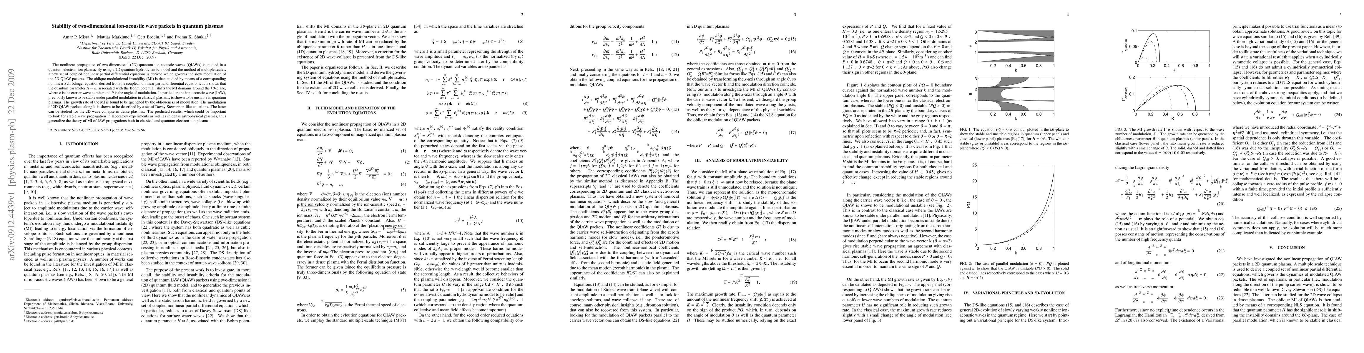This paper investigates the stability of two-dimensional quantum ion-acoustic wave packets in quantum plasmas using a 2D quantum hydrodynamic model. It reveals that the quantum parameter shifts modulation instability domains, showing that ion-acoustic waves, which are stable in classical plasmas, become unstable in quantum plasmas.