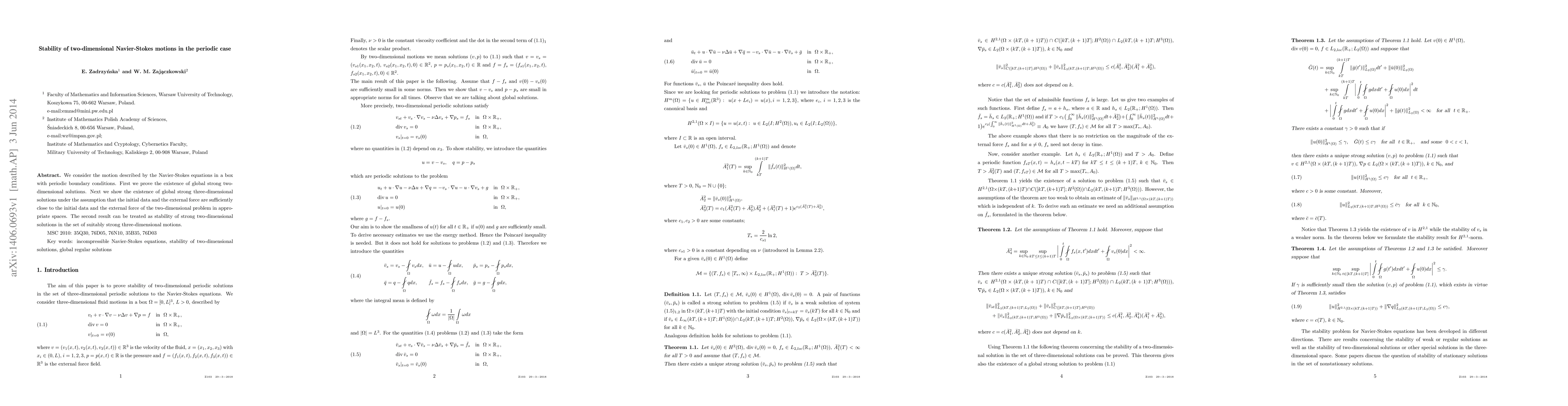 This paper proves the existence of global strong solutions for two-dimensional Navier-Stokes equations with periodic boundary conditions and demonstrates the stability of these solutions by showing the existence of global strong three-dimensional solutions under small perturbations.