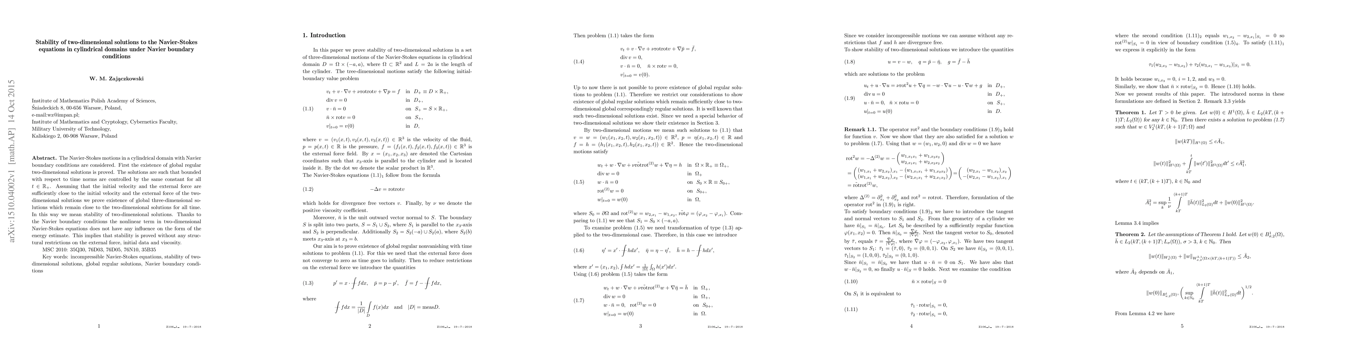 This paper proves the existence of global regular two-dimensional solutions to the Navier-Stokes equations in cylindrical domains with Navier boundary conditions. It also demonstrates the stability of these two-dimensional solutions by showing that three-dimensional solutions remain close to them over time.