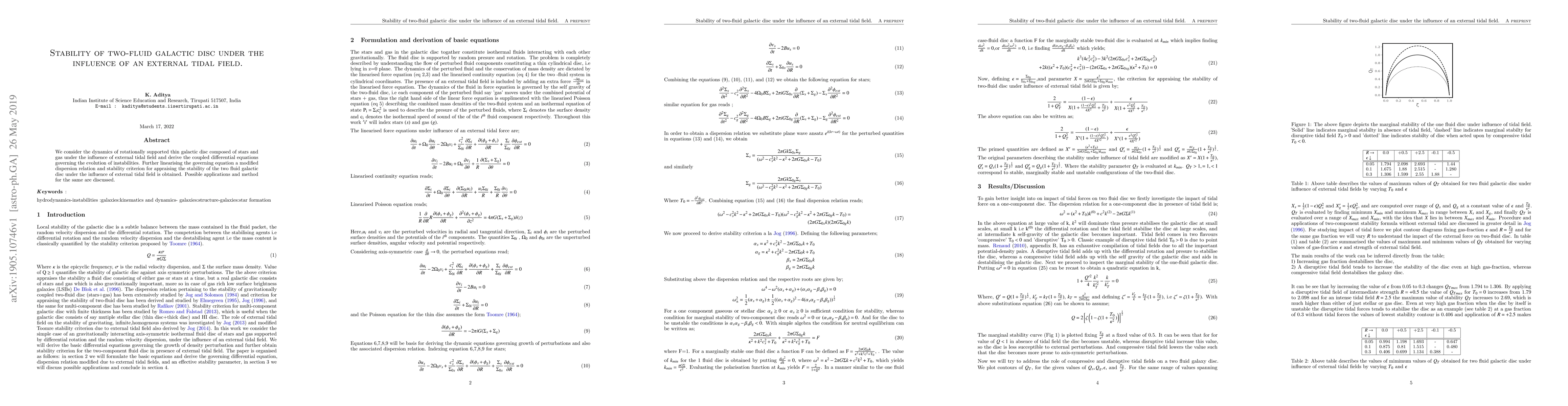 This paper derives the coupled differential equations for a two-fluid galactic disc's instabilities under an external tidal field, and obtains a modified dispersion relation and stability criterion for assessing its stability. The method's potential applications are also discussed.
