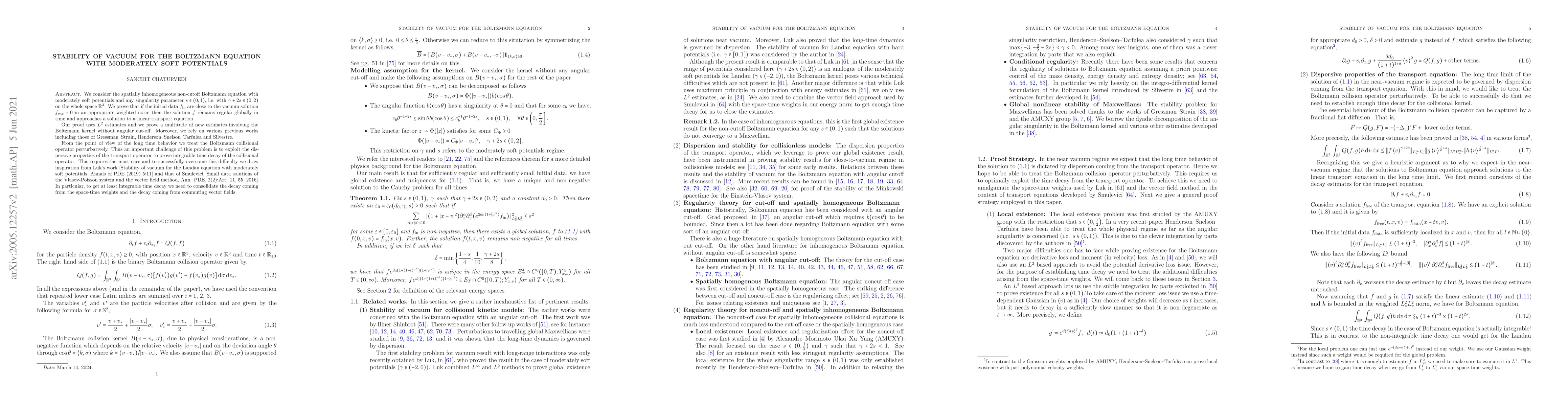 This paper investigates the stability of a vacuum solution for the Boltzmann equation with moderately soft potentials. It proves that initial data close to the vacuum remain regular and approach a linear transport solution, leveraging $L^2$ estimates and new results on the Boltzmann kernel. The study employs perturbation techniques and draws on previous works to achieve integrable time decay of the collisional operator.