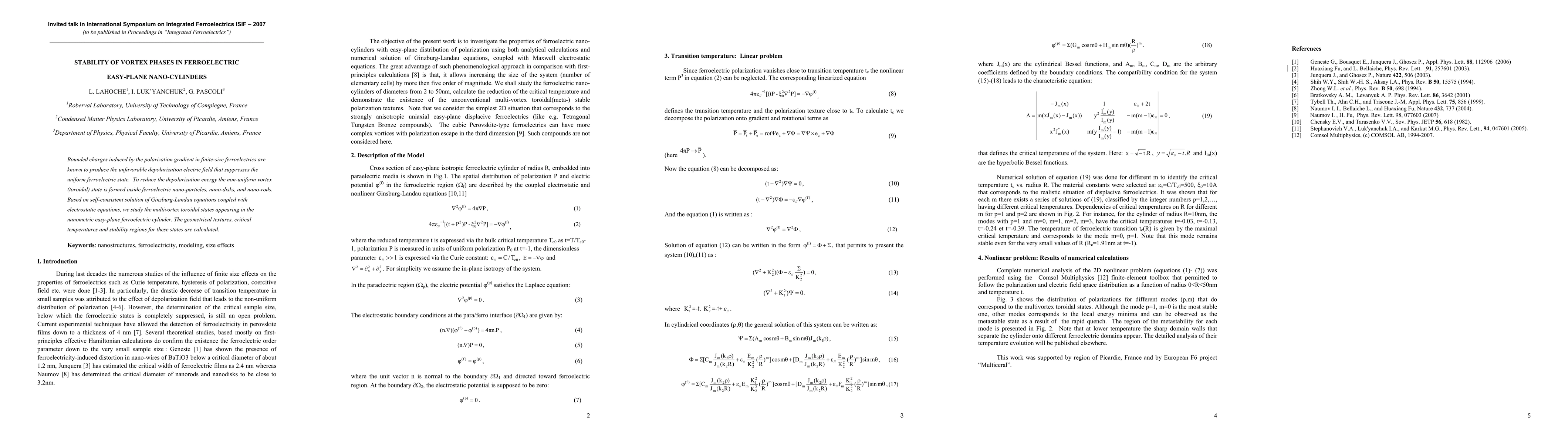 Bounded charges induced by the polarization gradient in finite-size ferroelectrics are known to produce the unfavorable depolarization electric field that suppresses the uniform ferroelectric state. To reduce the depolarization energy the non-uniform vortex (toroidal) state is formed inside ferroelectric nano-particles, nano-disks, and nano-rods. Based on self-consistent solution of Ginzburg-Landau equations coupled with electrostatic equations, we study the multivortex toroidal states appearing in the nanometric easy-plane ferroelectric cylinder. The geometrical textures, critical temperatures and stability regions for these states are calculated.