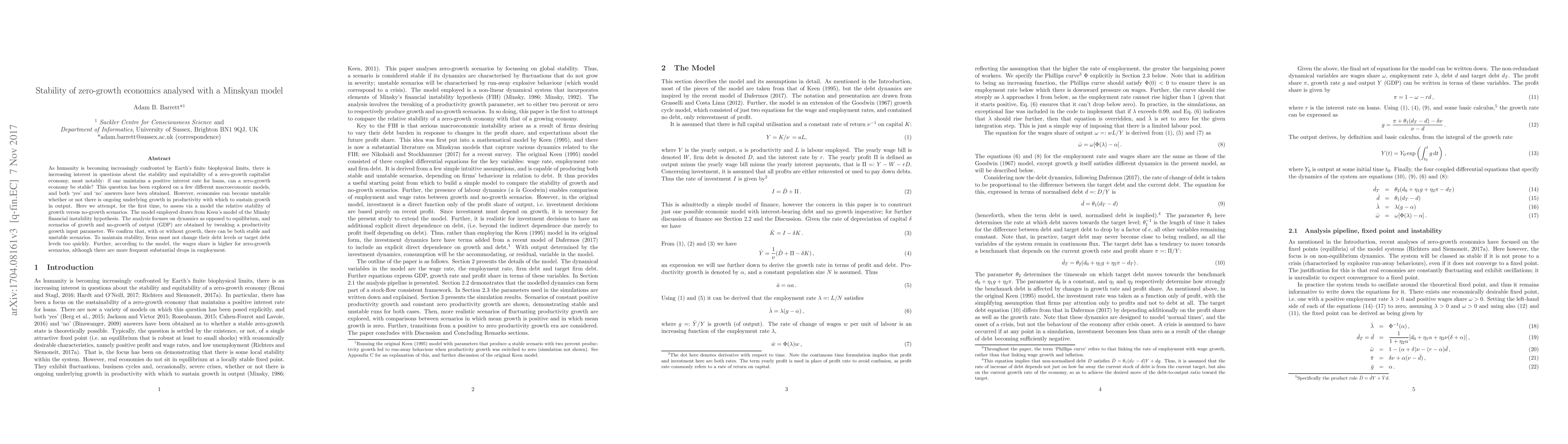 This research uses a Minskyan model to analyze the stability of zero-growth economics, finding that both stable and unstable scenarios exist with or without growth. Stability hinges on debt level adjustments, and the model suggests zero-growth scenarios may have higher wage shares but experience more significant employment drops.