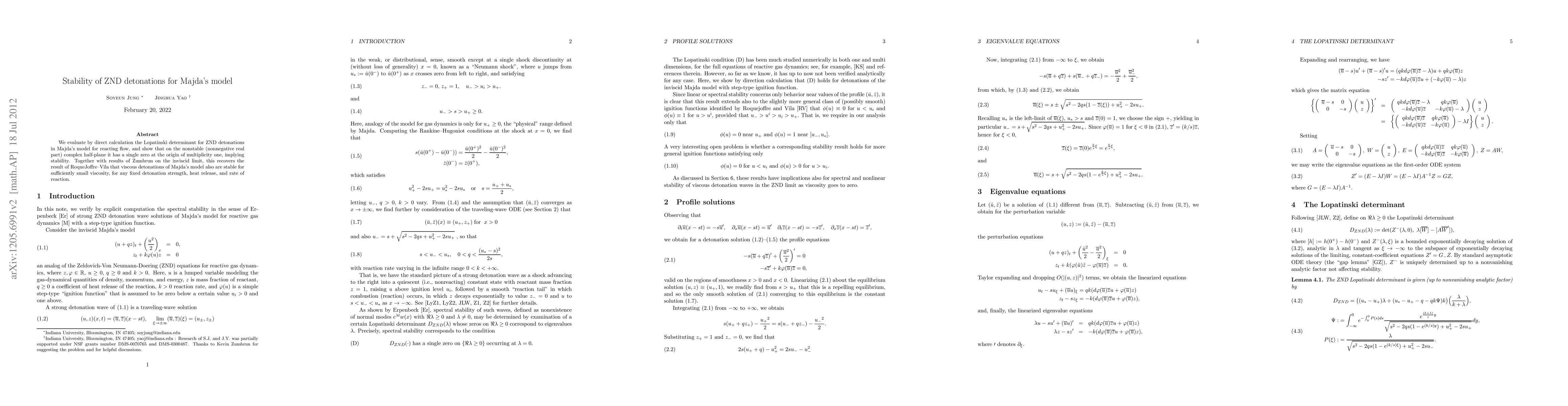 We evaluate by direct calculation the Lopatinski determinant for ZND detonations in Majda's model for reacting flow, and show that on the nonstable (nonnegative real part) complex half-plane it has a single zero at the origin of multiplicity one, implying stability. Together with results of Zumbrun on the inviscid limit, this recovers the result of RoqueJoffre-Vila that viscous detonations of Majda's model also are stable for sufficiently small viscosity, for any fixed detonation strength, heat release, and rate of reaction.