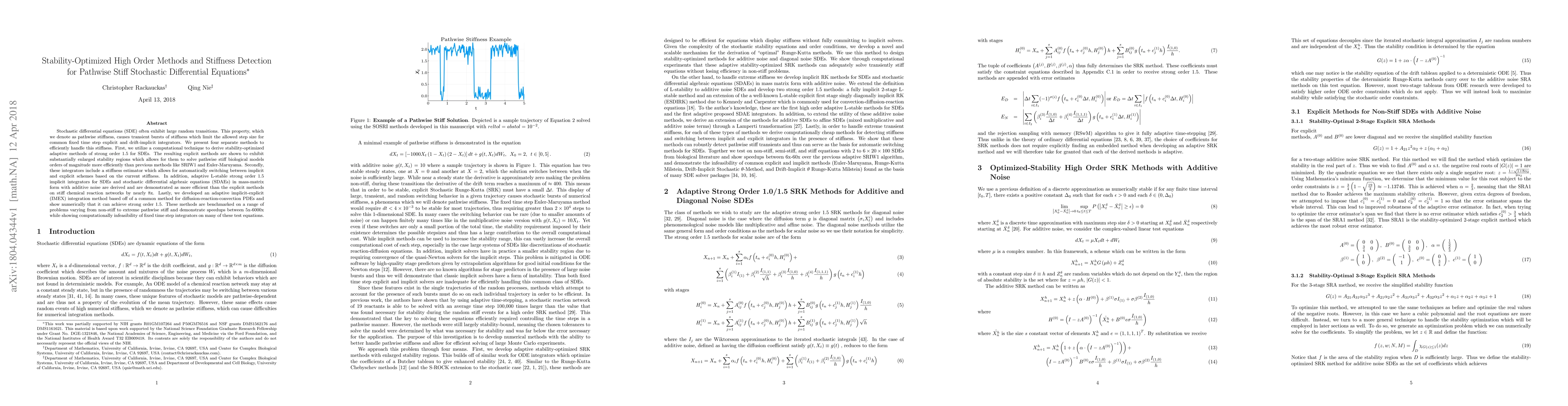 Stochastic differential equations (SDE) often exhibit large random transitions. This property, which we denote as pathwise stiffness, causes transient bursts of stiffness which limit the allowed step size for common fixed time step explicit and drift-implicit integrators. We present four separate methods to efficiently handle this stiffness. First, we utilize a computational technique to derive stability-optimized adaptive methods of strong order 1.5 for SDEs. The resulting explicit methods are shown to exhibit substantially enlarged stability regions which allows for them to solve pathwise stiff biological models orders of magnitude more efficiently than previous methods like SRIW1 and Euler-Maruyama. Secondly, these integrators include a stiffness estimator which allows for automatically switching between implicit and explicit schemes based on the current stiffness. In addition, adaptive L-stable strong order 1.5 implicit integrators for SDEs and stochastic differential algebraic equations (SDAEs) in mass-matrix form with additive noise are derived and are demonstrated as more efficient than the explicit methods on stiff chemical reaction networks by nearly 8x. Lastly, we developed an adaptive implicit-explicit (IMEX) integration method based off of a common method for diffusion-reaction-convection PDEs and show numerically that it can achieve strong order 1.5. These methods are benchmarked on a range of problems varying from non-stiff to extreme pathwise stiff and demonstrate speedups between 5x-6000x while showing computationally infeasibility of fixed time step integrators on many of these test equations.