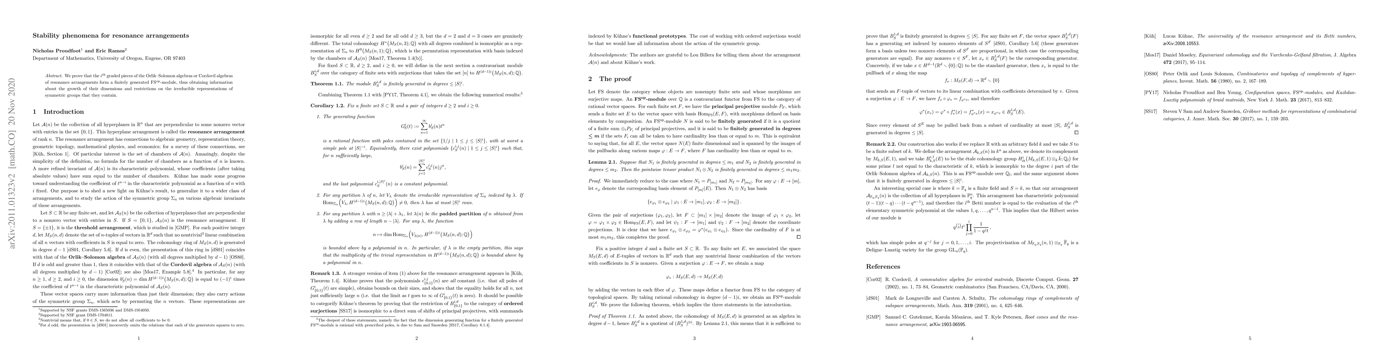 We prove that the ith graded pieces of the Orlik-Solomon algebras or Cordovil algebras of resonance arrangements form a finitely generated FS^op-module, thus obtaining information about the growth of their dimensions and restrictions on the irreducible representations of symmetric groups that they contain.