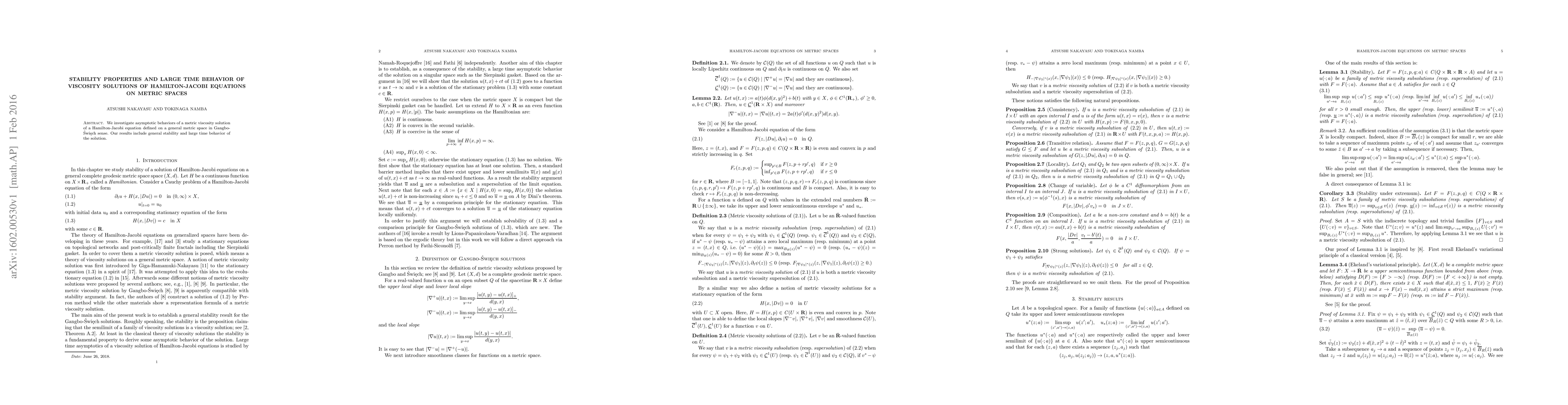 We investigate asymptotic behaviors of a metric viscosity solution of a Hamilton-Jacobi equation defined on a general metric space in Gangbo-\'{S}wi\c{e}ch sense. Our results include general stability and large time behavior of the solution.
