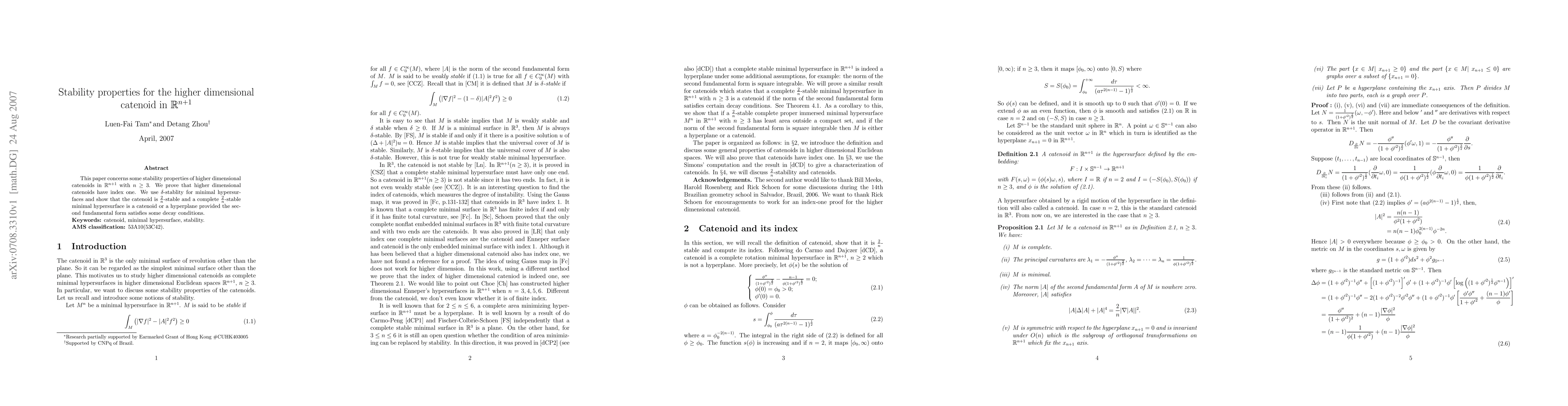 This paper investigates stability properties of higher dimensional catenoids in n+1 dimensions, proving they have index one and show 2n-stability under certain conditions.