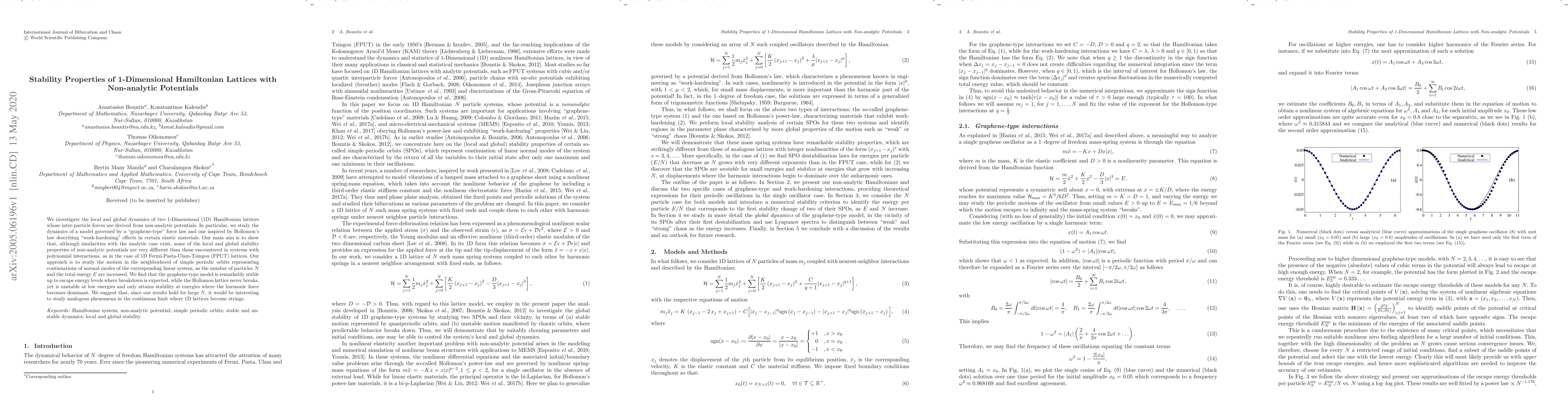 We investigate the local and global dynamics of two 1-Dimensional (1D) Hamiltonian lattices whose inter-particle forces are derived from non-analytic potentials. In particular, we study the dynamics of a model governed by a "graphene-type" force law and one inspired by Hollomon's law describing "work-hardening" effects in certain elastic materials. Our main aim is to show that, although similarities with the analytic case exist, some of the local and global stability properties of non-analytic potentials are very different than those encountered in systems with polynomial interactions, as in the case of 1D Fermi-Pasta-Ulam-Tsingou (FPUT) lattices. Our approach is to study the motion in the neighborhood of simple periodic orbits representing continuations of normal modes of the corresponding linear system, as the number of particles $N$ and the total energy $E$ are increased. We find that the graphene-type model is remarkably stable up to escape energy levels where breakdown is expected, while the Hollomon lattice never breaks, yet is unstable at low energies and only attains stability at energies where the harmonic force becomes dominant. We suggest that, since our results hold for large $N$, it would be interesting to study analogous phenomena in the continuum limit where 1D lattices become strings.