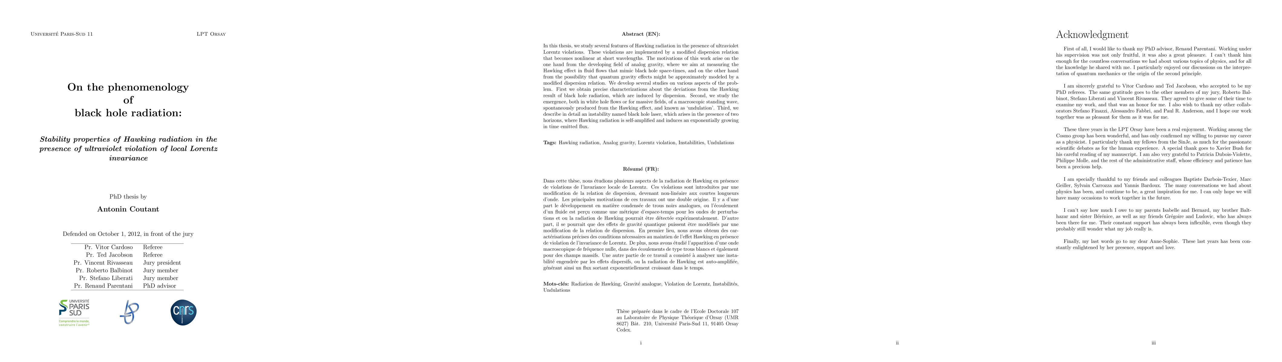In this thesis, we study several features of Hawking radiation in the presence of ultraviolet Lorentz violations. These violations are implemented by a modified dispersion relation that becomes nonlinear at short wavelengths. The motivations of this work arise on the one hand from the developing field of analog gravity, where we aim at measuring the Hawking effect in fluid flows that mimic black hole space-times, and on the other hand from the possibility that quantum gravity effects might be approximately modeled by a modified dispersion relation. We develop several studies on various aspects of the problem. First we obtain precise characterizations about the deviations from the Hawking result of black hole radiation, which are induced by dispersion. Second, we study the emergence, both in white hole flows or for massive fields, of a macroscopic standing wave, spontaneously produced from the Hawking effect, and known as `undulation'. Third, we describe in detail an instability named black hole laser, which arises in the presence of two horizons, where Hawking radiation is self-amplified and induces an exponentially growing in time emitted flux.