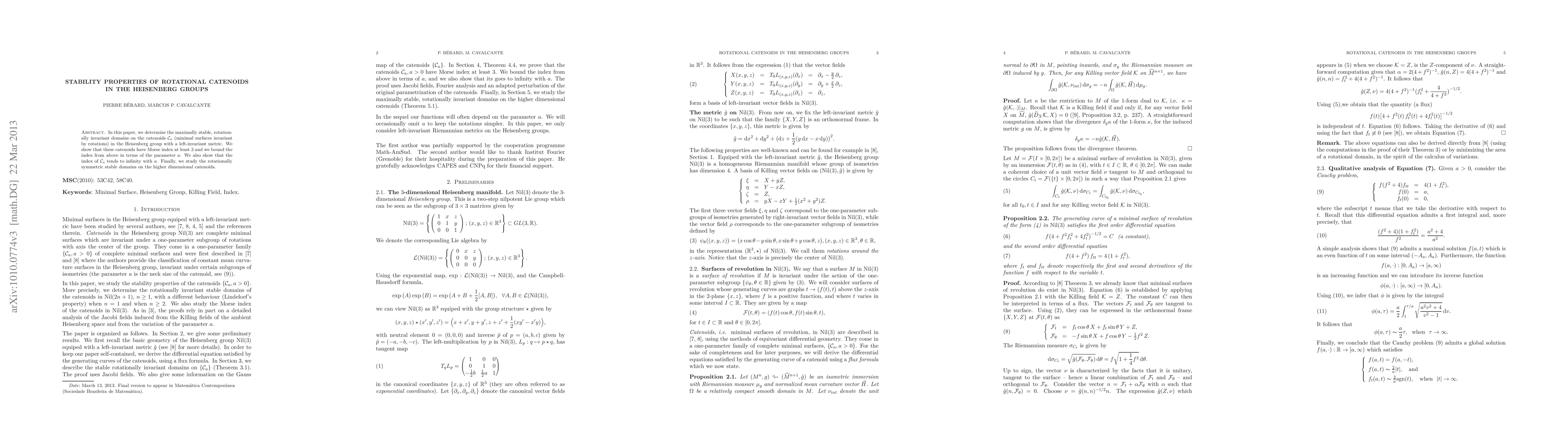 In this paper, we determine the maximally stable, rotationally invariant domains on the catenoids $\cC_a$ (minimal surfaces invariant by rotations) in the Heisenberg group with a left-invariant metric. We show that these catenoids have Morse index at least 3 and we bound the index from above in terms of the parameter $a$. We also show that the index of $\cC_a$ tends to infinity with $a$. Finally, we study the rotationally symmetric stable domains on the higher dimensional catenoids.