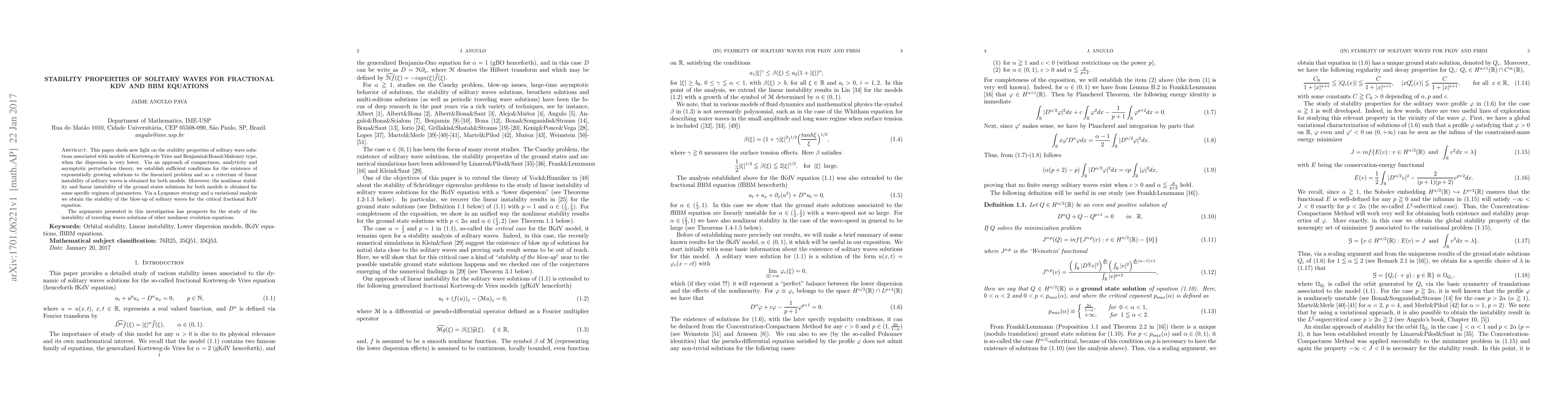 This paper sheds new light on the stability properties of solitary wave solutions associated with models of Korteweg-de Vries and Benjamin\&Bona\&Mahoney type, when the dispersion is very lower. Via an approach of compactness, analyticity and asymptotic perturbation theory, we establish sufficient conditions for the existence of exponentially growing solutions to the linearized problem and so a criterium of linear instability of solitary waves is obtained for both models. Moreover, the nonlinear stability and linear instability of the ground states solutions for both models is obtained for some specific regimen of parameters. Via a Lyapunov strategy and a variational analysis we obtain the stability of the blow-up of solitary waves for the critical fractional KdV equation. The arguments presented in this investigation has prospects for the study of the instability of traveling waves solutions of other nonlinear evolution equations.