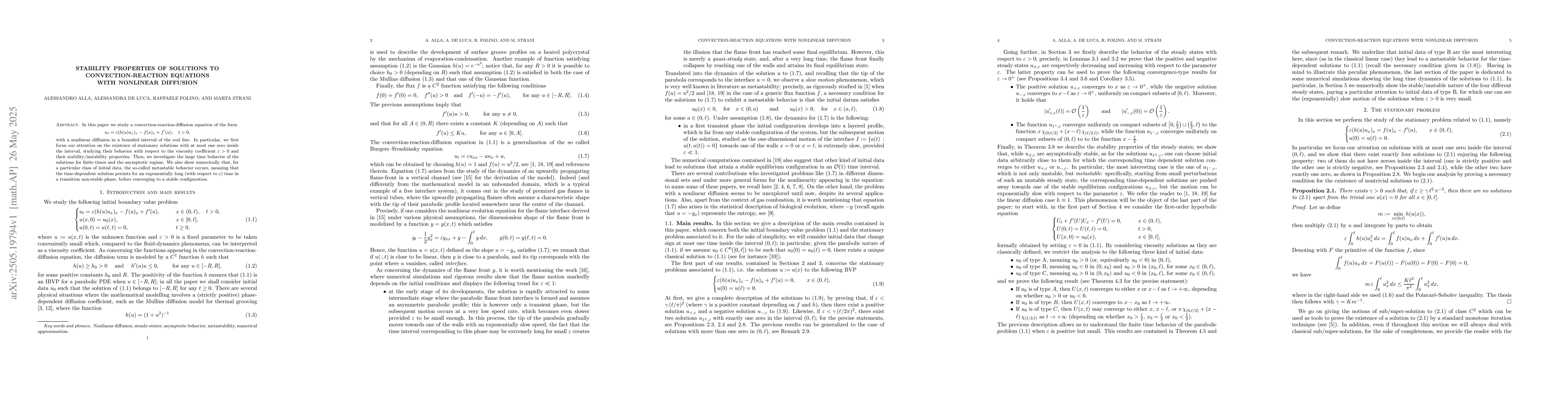 The paper presents a detailed analysis of stationary solutions' existence, stability, and large time behavior for convection-reaction-diffusion equations with nonlinear diffusion, including numerical evidence of metastable phenomena.
