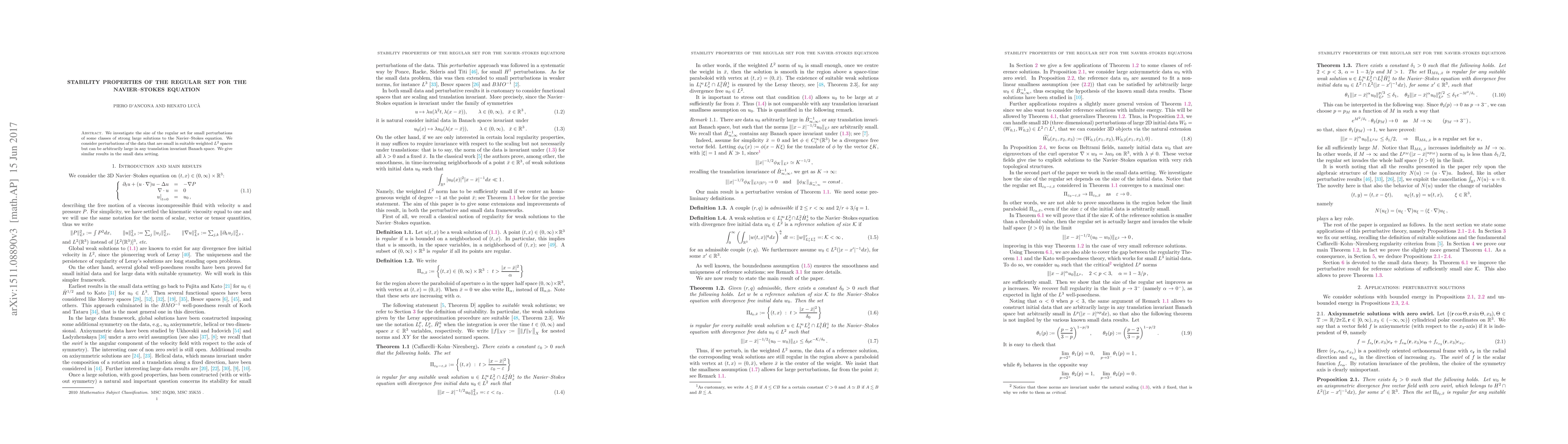 We investigate the size of the regular set for small perturbations of some classes of strong large solutions to the Navier--Stokes equation. We consider perturbations of the data which are small in suitable weighted $L^{2}$ spaces but can be arbitrarily large in any translation invariant critical Banach space. We give similar results in the small data setting.