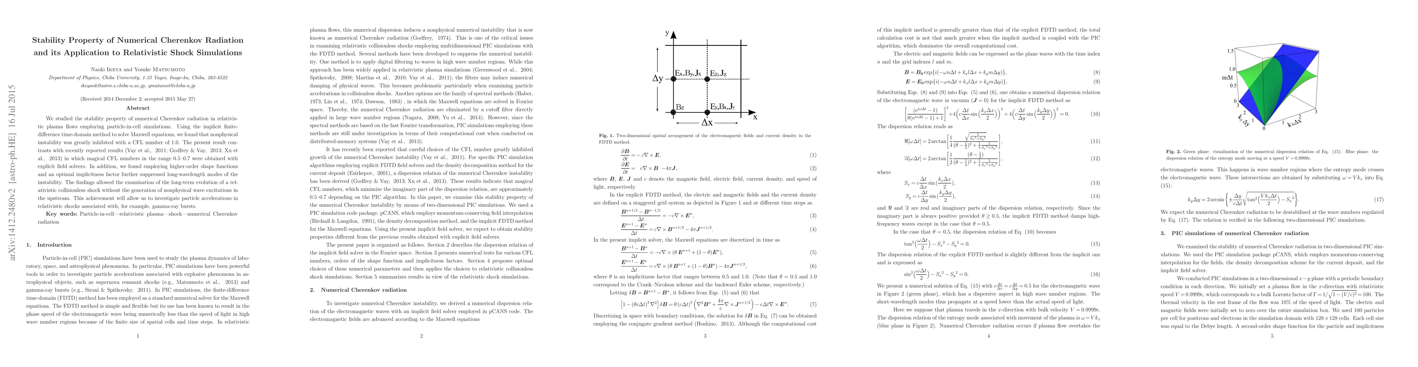 This paper investigates the stability of numerical Cherenkov radiation in relativistic plasma flows using particle-in-cell simulations, finding that a CFL number of 1.0 significantly reduces nonphysical instabilities compared to previous studies using explicit solvers. The use of higher-order shape functions and an optimal implicitness factor further mitigates instability, enabling detailed simulations of relativistic shock evolution without spurious wave excitations.