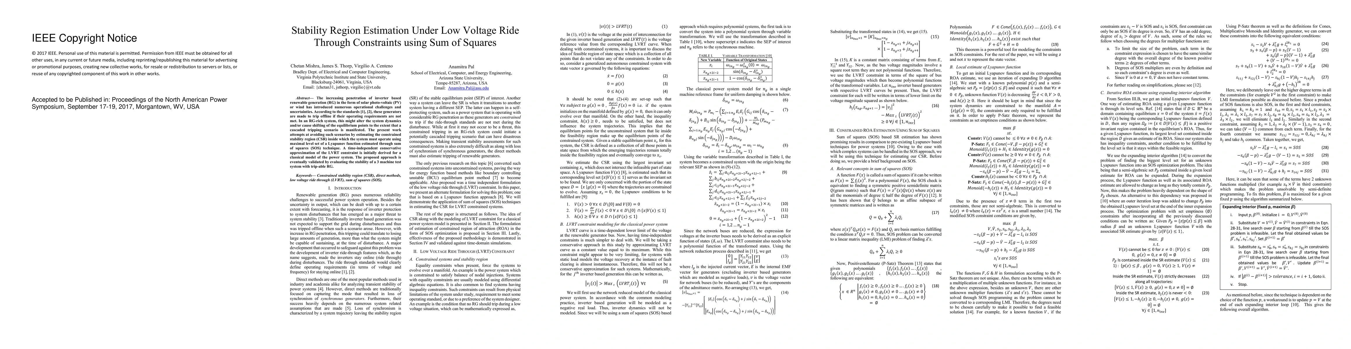 This paper proposes a method to estimate the constrained stability region (CSR) for power systems with high renewable generation penetration, using the sum of squares (SOS) technique to derive a maximal level set of a Lyapunov function. The approach aims to prevent cascading tripping scenarios by ensuring system stability under low voltage ride-through (LVRT) constraints.