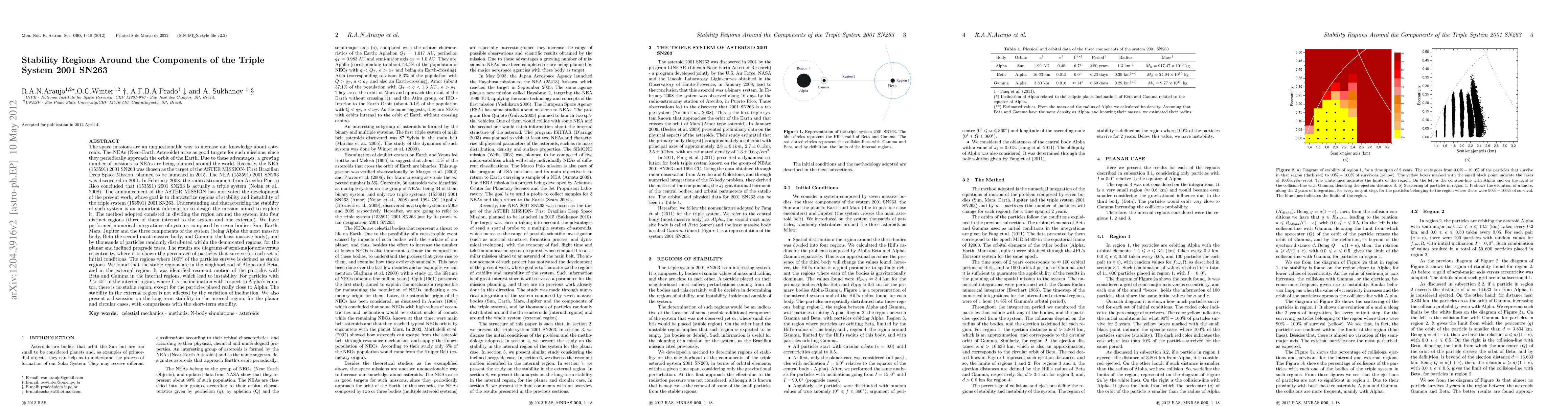 The study characterizes stability regions in a triple asteroid system 2001 SN263, identifying areas where particles survive for extended periods, and regions prone to instability due to resonant motion with other asteroids.