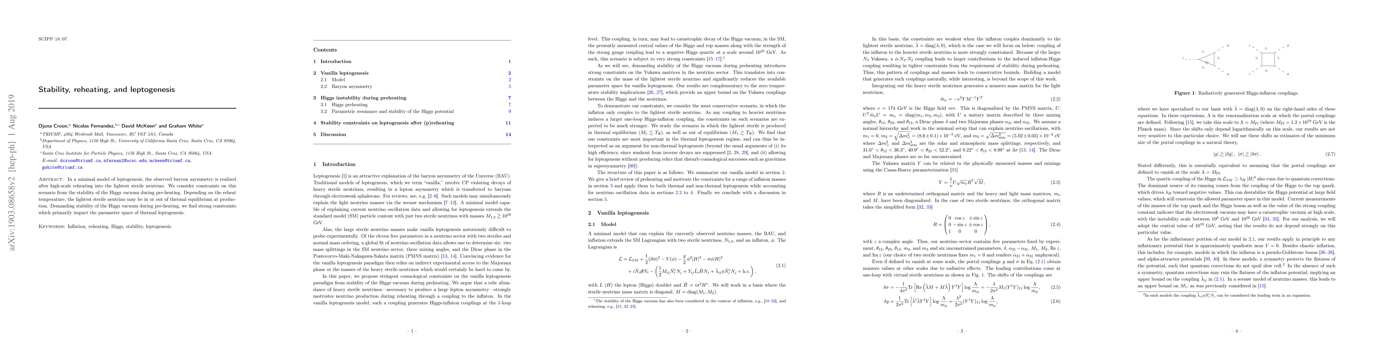 This paper explores a minimal leptogenesis model where baryon asymmetry arises post high-scale reheating into the lightest sterile neutrino. It imposes constraints on the scenario from the stability of the Higgs vacuum during pre-heating, finding that these constraints significantly restrict the parameter space for thermal leptogenesis.