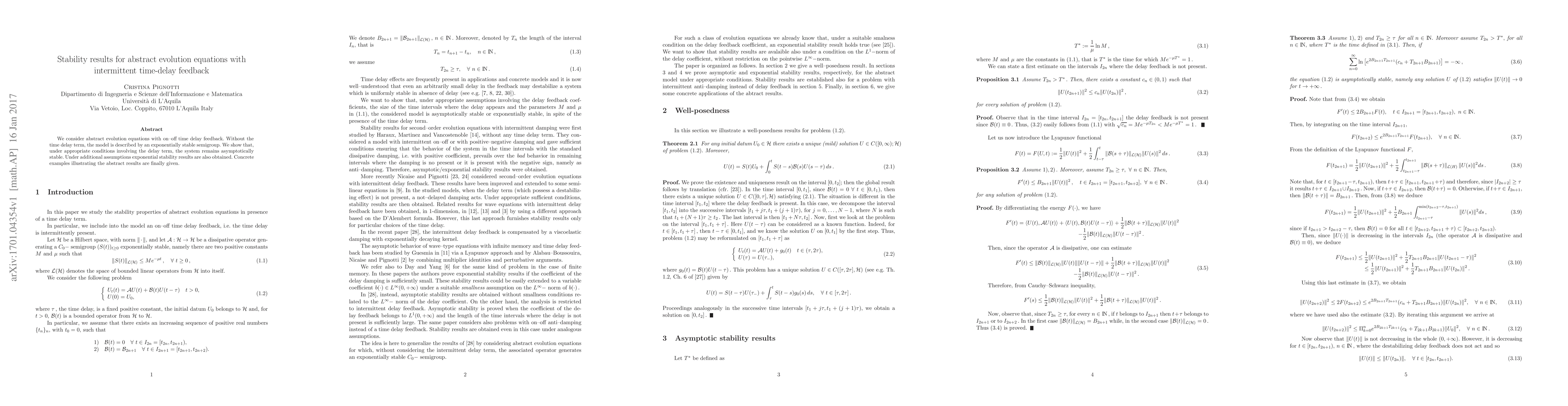 This paper investigates the stability of abstract evolution equations with intermittent time-delay feedback. It demonstrates that the system remains asymptotically stable under specific conditions involving the delay term, and exponential stability can be achieved under additional assumptions.