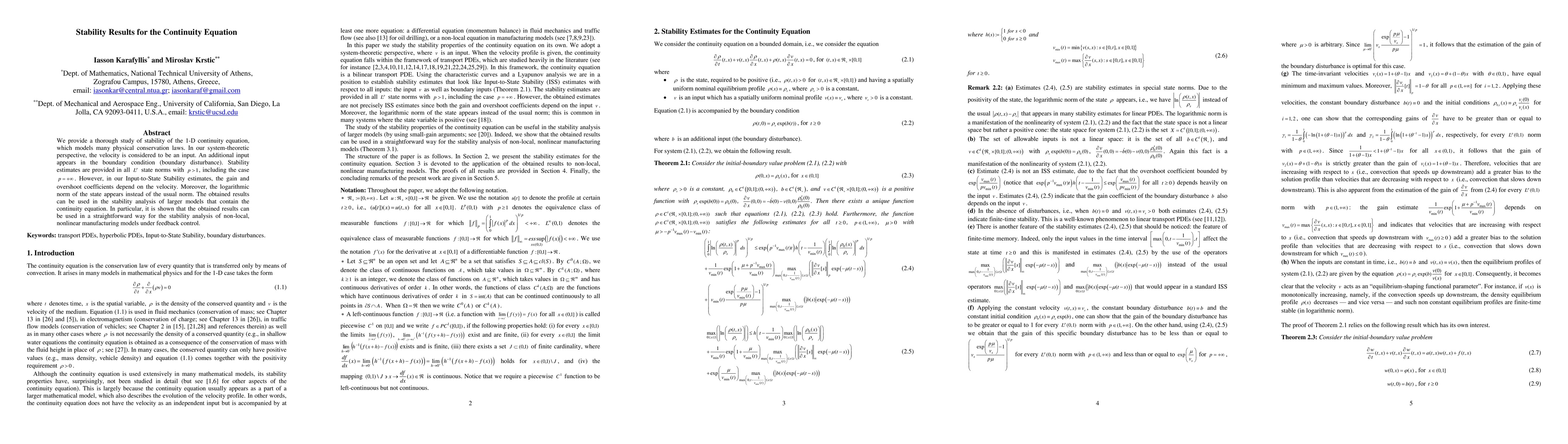 We provide a thorough study of stability of the 1-D continuity equation, which models many physical conservation laws. In our system-theoretic perspective, the velocity is considered to be an input. An additional input appears in the boundary condition (boundary disturbance). Stability estimates are provided in all Lp state norms with p>1, as well as in the sup norm. However, in our Input-to-State Stability estimates, the gain and overshoot coefficients depend on the velocity. Moreover, the logarithmic norm of the state appears instead of the usual norm. The obtained results can be used in the stability analysis of larger models that contain the continuity equation. In particular, it is shown that the obtained results can be used in a straightforward way for the stability analysis of non-local, nonlinear manufacturing models under feedback control.