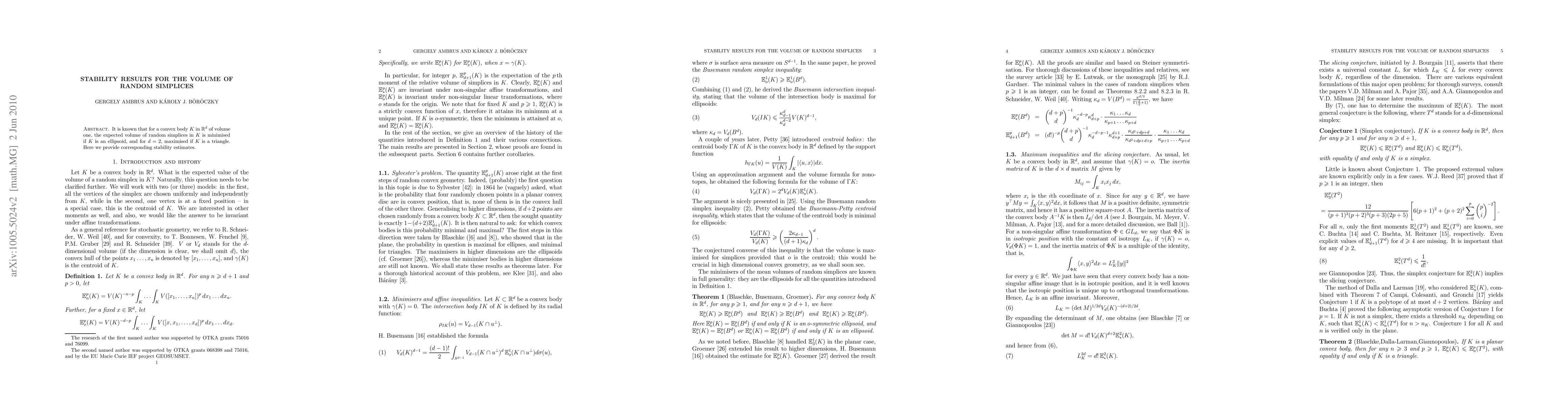 This paper presents stability results for the volume of random simplices within a convex body K in R^d, showing that the expected volume is minimized when K is an ellipsoid and maximized when K is a triangle in two dimensions. The study also provides corresponding stability estimates for these configurations.
