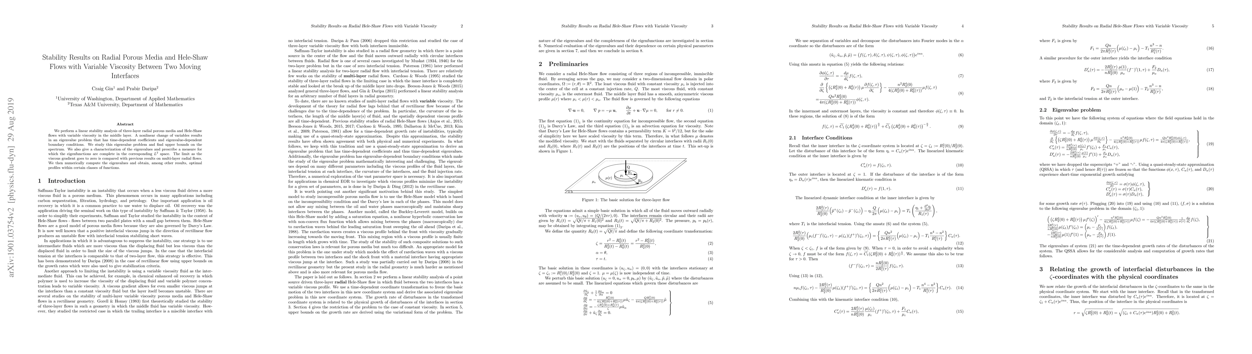 We perform a linear stability analysis of three-layer radial porous media and Hele-Shaw flows with variable viscosity in the middle layer. A nonlinear change of variables results in an eigenvalue problem that has time-dependent coefficients and eigenvalue-dependent boundary conditions. We study this eigenvalue problem and find upper bounds on the spectrum. We also give a characterization of the eigenvalues and prescribe a measure for which the eigenfunctions are complete in the corresponding $L^2$ space. The limit as the viscous gradient goes to zero is compared with previous results on multi-layer radial flows. We then numerically compute the eigenvalues and obtain, among other results, optimal profiles within certain classes of functions.