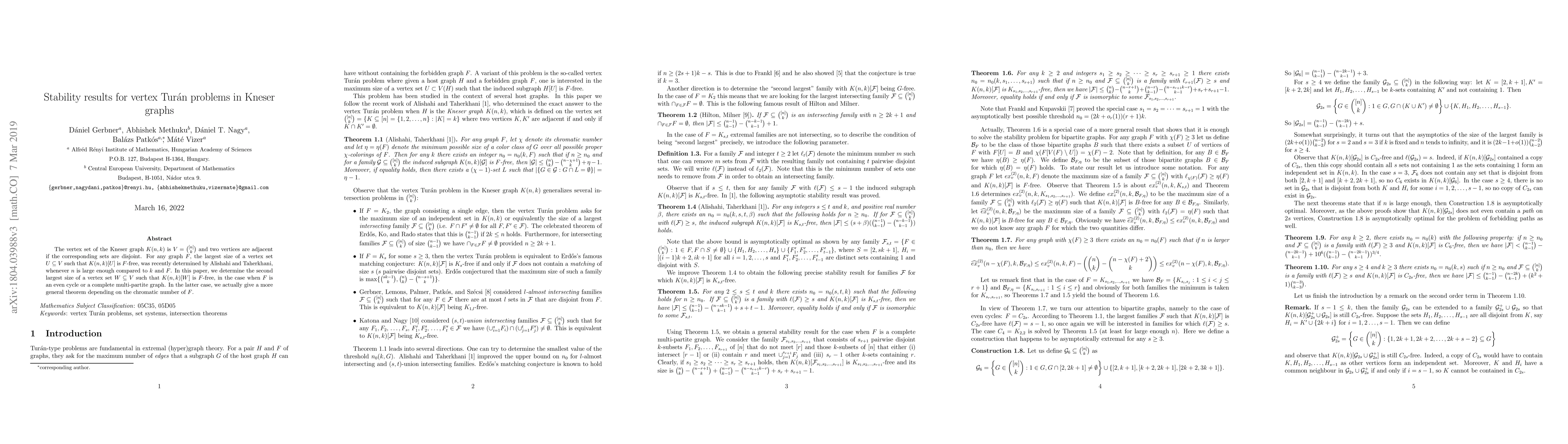 Researchers determined the second-largest size of a vertex set in Kneser graphs that makes them free from specific types of graphs, improving on previous results for large n compared to k.