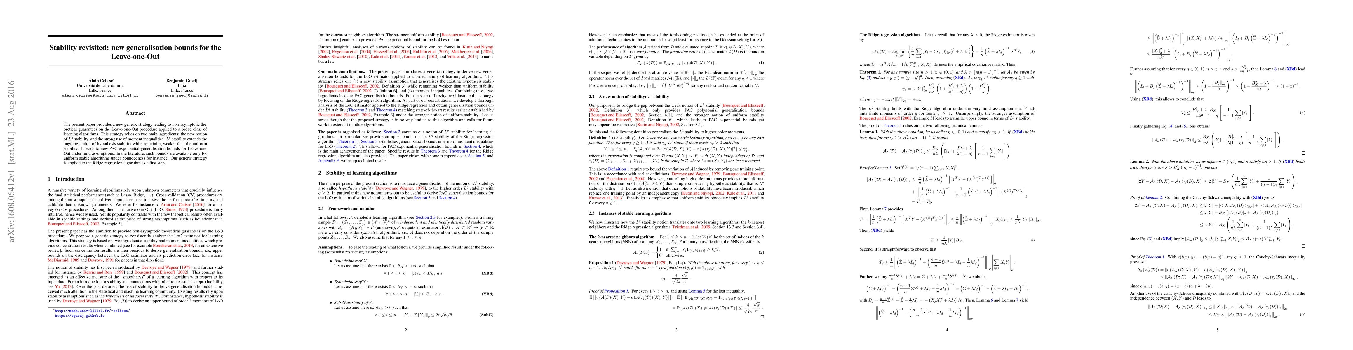 This paper introduces a new generic strategy for obtaining non-asymptotic theoretical guarantees for the Leave-one-Out procedure, utilizing $L^q$ stability and moment inequalities. It provides new PAC exponential generalisation bounds for Leave-one-Out applicable to a wide range of learning algorithms, demonstrated initially through Ridge regression.