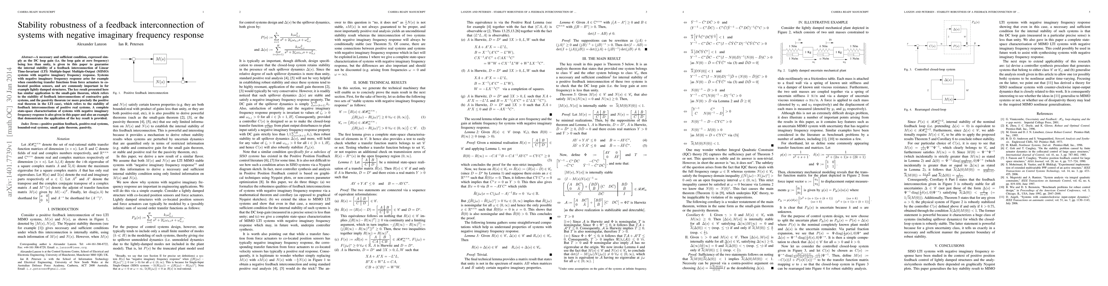 A necessary and sufficient condition, expressed simply as the DC loop gain (ie the loop gain at zero frequency) being less than unity, is given in this paper to guarantee the internal stability of a feedback interconnection of Linear Time-Invariant (LTI) Multiple-Input Multiple-Output (MIMO) systems with negative imaginary frequency response. Systems with negative imaginary frequency response arise for example when considering transfer functions from force actuators to co-located position sensors, and are commonly important in for example lightly damped structures. The key result presented here has similar application to the small-gain theorem, which refers to the stability of feedback interconnections of contractive gain systems, and the passivity theorem (or more precisely the positive real theorem in the LTI case), which refers to the stability of feedback interconnections of positive real systems. A complete state-space characterisation of systems with negative imaginary frequency response is also given in this paper and also an example that demonstrates the application of the key result is provided.