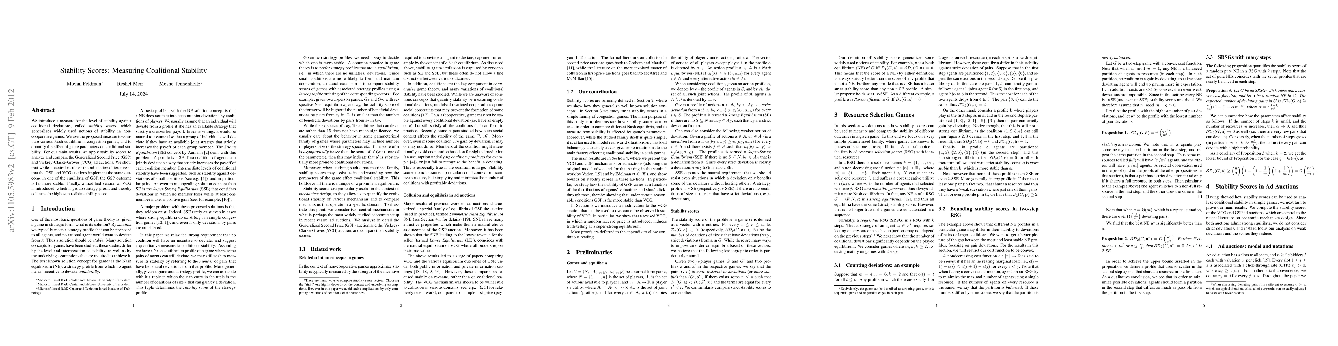 We introduce a measure for the level of stability against coalitional deviations, called \emph{stability scores}, which generalizes widely used notions of stability in non-cooperative games. We use the proposed measure to compare various Nash equilibria in congestion games, and to quantify the effect of game parameters on coalitional stability. For our main results, we apply stability scores to analyze and compare the Generalized Second Price (GSP) and Vickrey-Clarke-Groves (VCG) ad auctions. We show that while a central result of the ad auctions literature is that the GSP and VCG auctions implement the same outcome in one of the equilibria of GSP, the GSP outcome is far more stable. Finally, a modified version of VCG is introduced, which is group strategy-proof, and thereby achieves the highest possible stability score.
