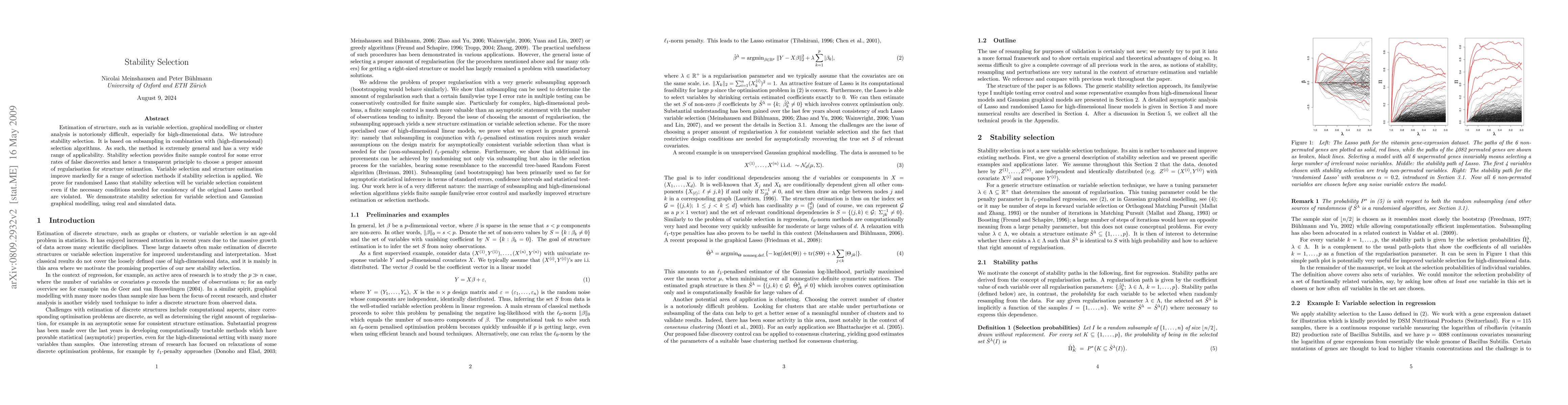 Estimation of structure, such as in variable selection, graphical modelling or cluster analysis is notoriously difficult, especially for high-dimensional data. We introduce stability selection. It is based on subsampling in combination with (high-dimensional) selection algorithms. As such, the method is extremely general and has a very wide range of applicability. Stability selection provides finite sample control for some error rates of false discoveries and hence a transparent principle to choose a proper amount of regularisation for structure estimation. Variable selection and structure estimation improve markedly for a range of selection methods if stability selection is applied. We prove for randomised Lasso that stability selection will be variable selection consistent even if the necessary conditions needed for consistency of the original Lasso method are violated. We demonstrate stability selection for variable selection and Gaussian graphical modelling, using real and simulated data.