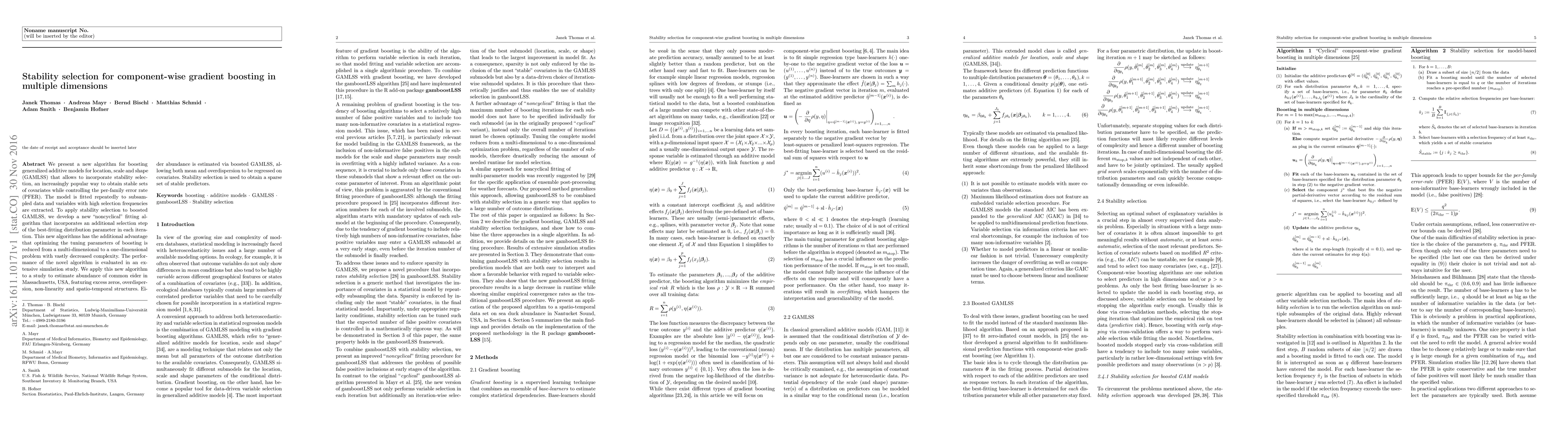 This paper introduces a new stability selection algorithm for component-wise gradient boosting in generalized additive models for location, scale, and shape (GAMLSS). The method reduces tuning parameter optimization complexity and is evaluated through simulations and applied to estimate eider abundance in Massachusetts, using stable covariates selection.
