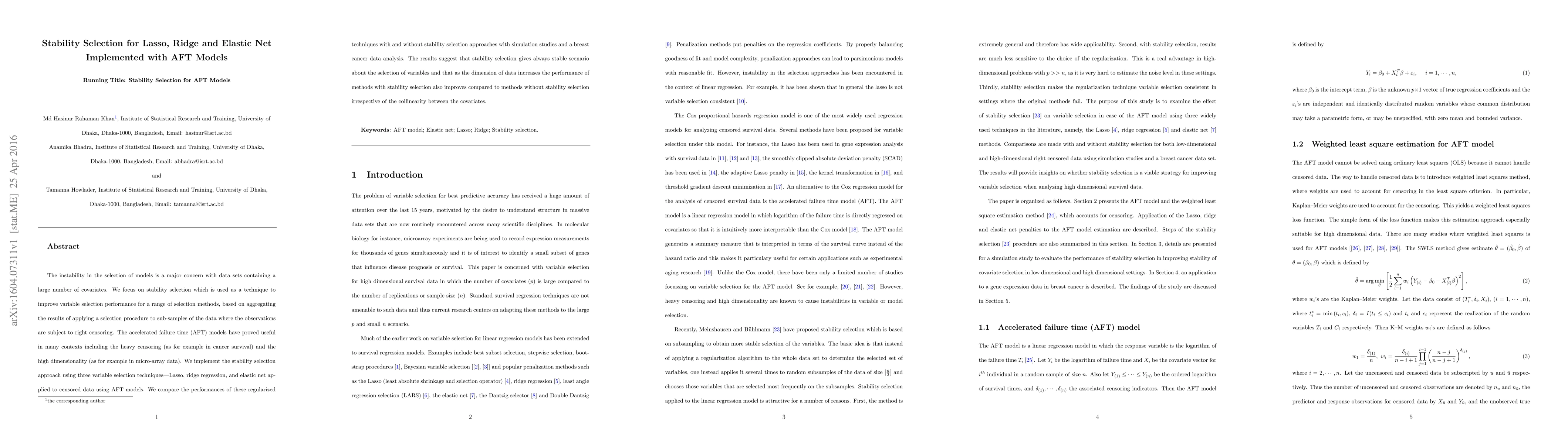 This paper investigates the application of stability selection to improve variable selection in Lasso, ridge, and elastic net methods, implemented with accelerated failure time (AFT) models for censored data. Results from simulation and breast cancer data analysis show that stability selection enhances the stability and performance of these methods, especially in high-dimensional settings.
