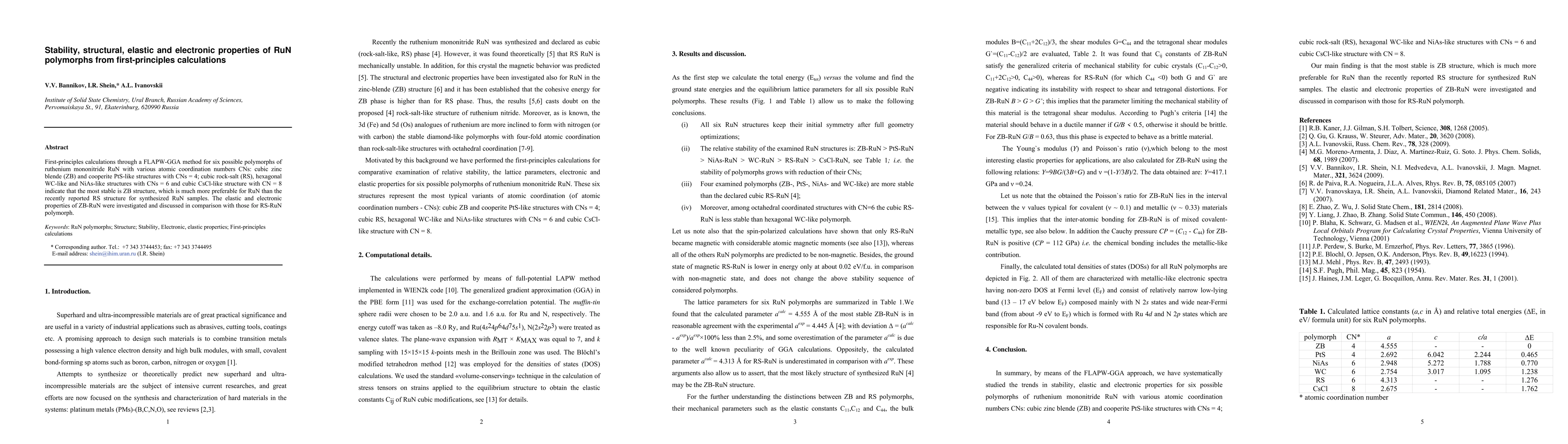 This study uses first-principles calculations to determine the stability and properties of six RuN polymorphs. The cubic zinc blende (ZB) structure is found to be the most stable, surpassing the previously reported cubic rock-salt (RS) structure. The ZB-RuN exhibits favorable elastic and electronic properties compared to RS-RuN.