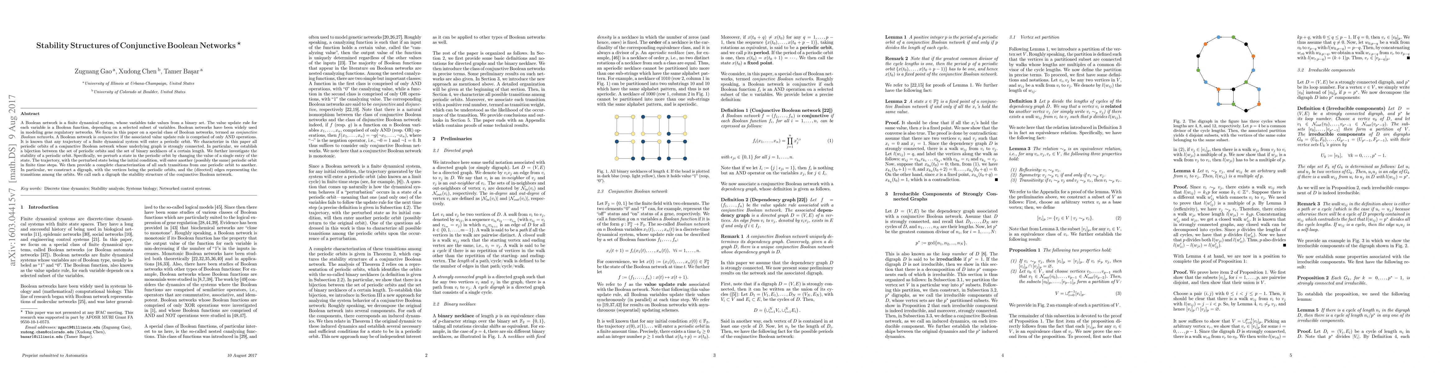 This paper explores the stability structures of conjunctive Boolean networks, focusing on their periodic orbits. It establishes a bijection between periodic orbits and binary necklaces, and characterizes transitions between these orbits under state perturbations, constructing a digraph termed the stability structure.