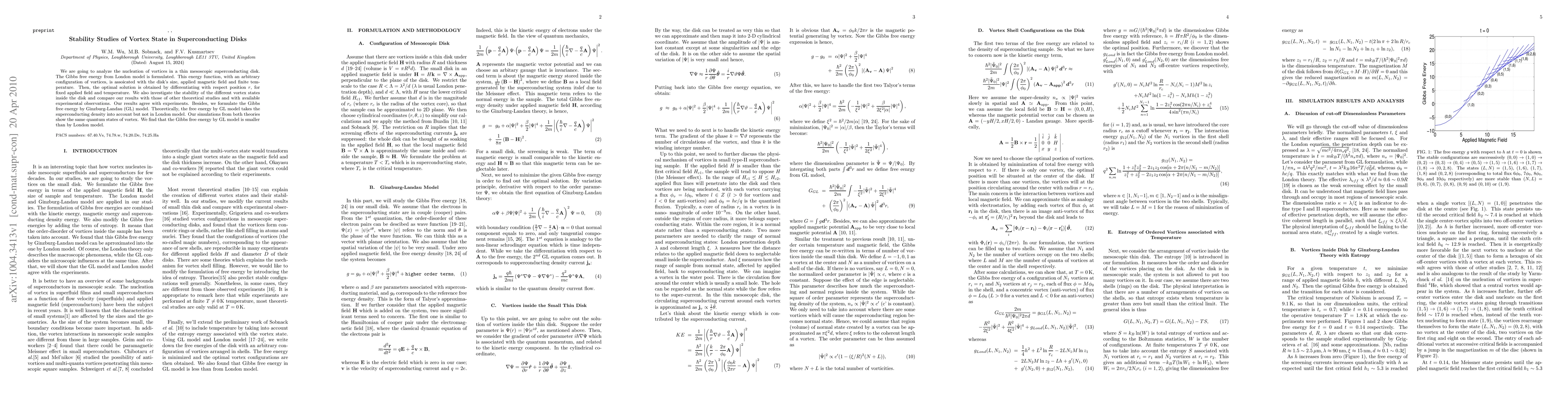 Researchers studied the stability of vortices in superconducting disks using London and Ginzburg-Landau models, finding that both theories predict the same quantum states of vortex, but the GL model has a lower Gibbs free energy.