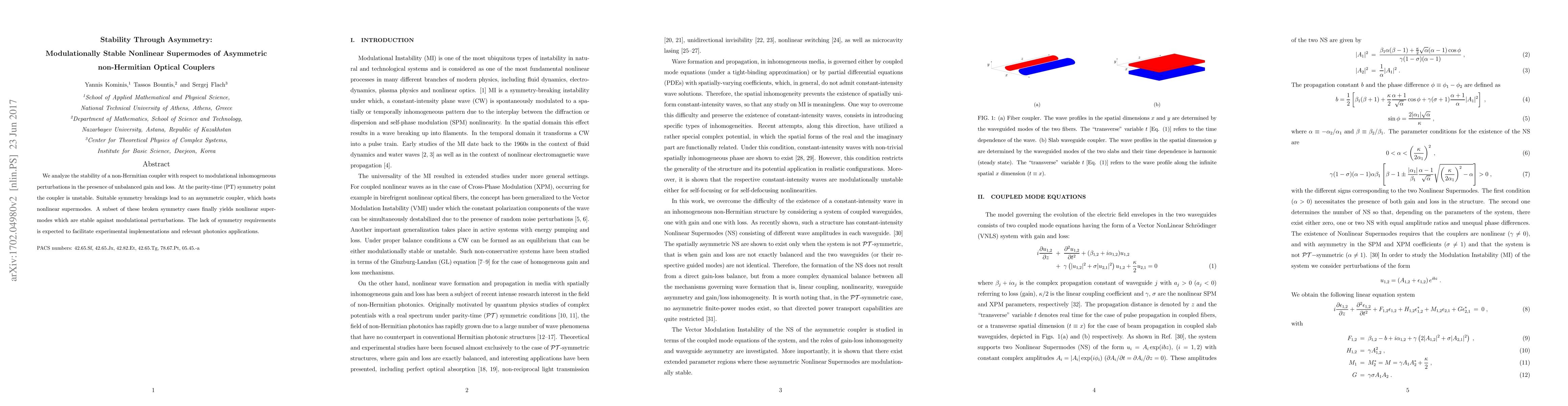 We analyze the stability of a non-Hermitian coupler with respect to modulational inhomogeneous perturbations in the presence of unbalanced gain and loss. At the parity-time (PT) symmetry point the coupler is unstable. Suitable symmetry breakings lead to an asymmetric coupler, which hosts nonlinear supermodes. A subset of those broken symmetry cases finally yields nonlinear supermodes which are stable against modulational perturbations. The lack of symmetry requirements will facilitate experimental implementations and relevant photonics applications.
