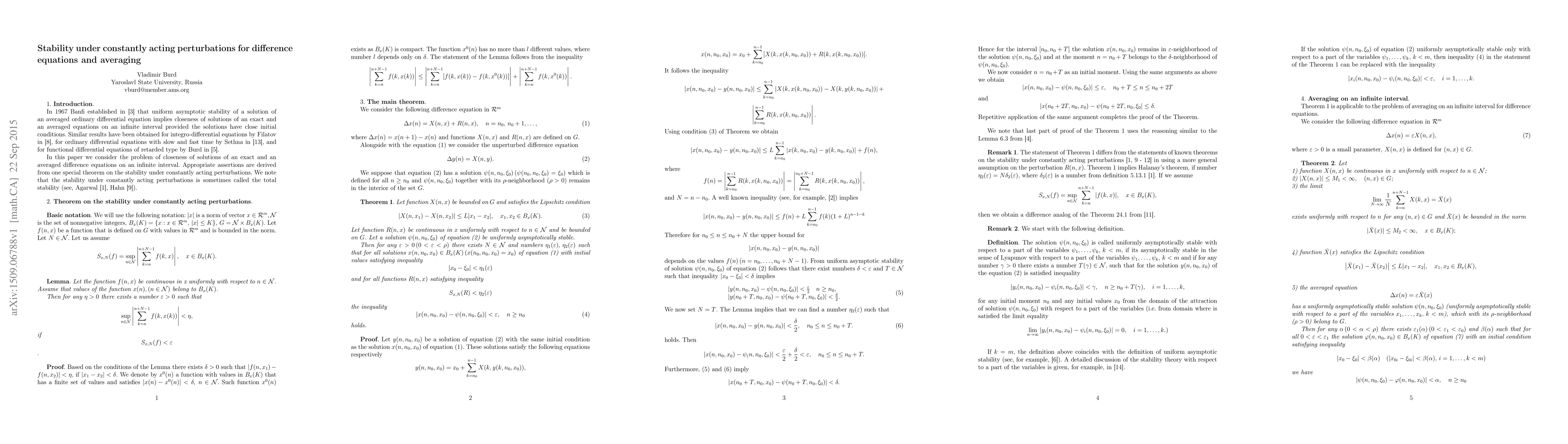 We consider the problem of closeness of solutions of an exact and an averaged difference equations on an infinite interval. Appropriate assertions are derived from one special theorem on the stability under constantly acting perturbations.