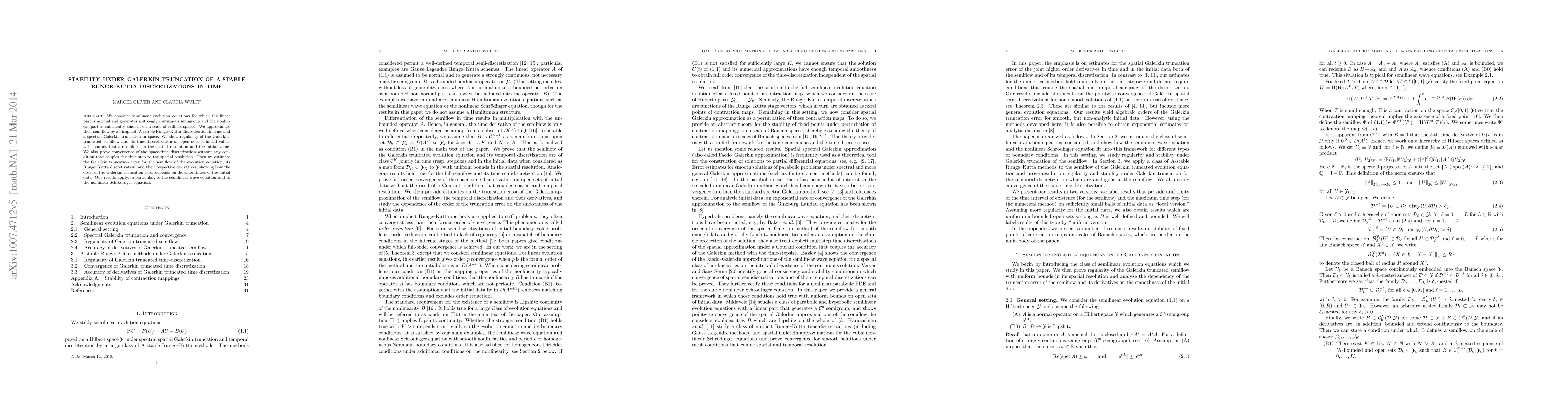 We consider semilinear evolution equations for which the linear part is normal and generates a strongly continuous semigroup and the nonlinear part is sufficiently smooth on a scale of Hilbert spaces. We approximate their semiflow by an implicit, A-stable Runge--Kutta discretization in time and a spectral Galerkin truncation in space. We show regularity of the Galerkin-truncated semiflow and its time-discretization on open sets of initial values with bounds that are uniform in the spatial resolution and the initial value. We also prove convergence of the space-time discretization without any condition that couples the time step to the spatial resolution. Then we estimate the Galerkin truncation error for the semiflow of the evolution equation, its Runge--Kutta discretization, and their respective derivatives, showing how the order of the Galerkin truncation error depends on the smoothness of the initial data. Our results apply, in particular, to the semilinear wave equation and to the nonlinear Schr\"odinger equation.