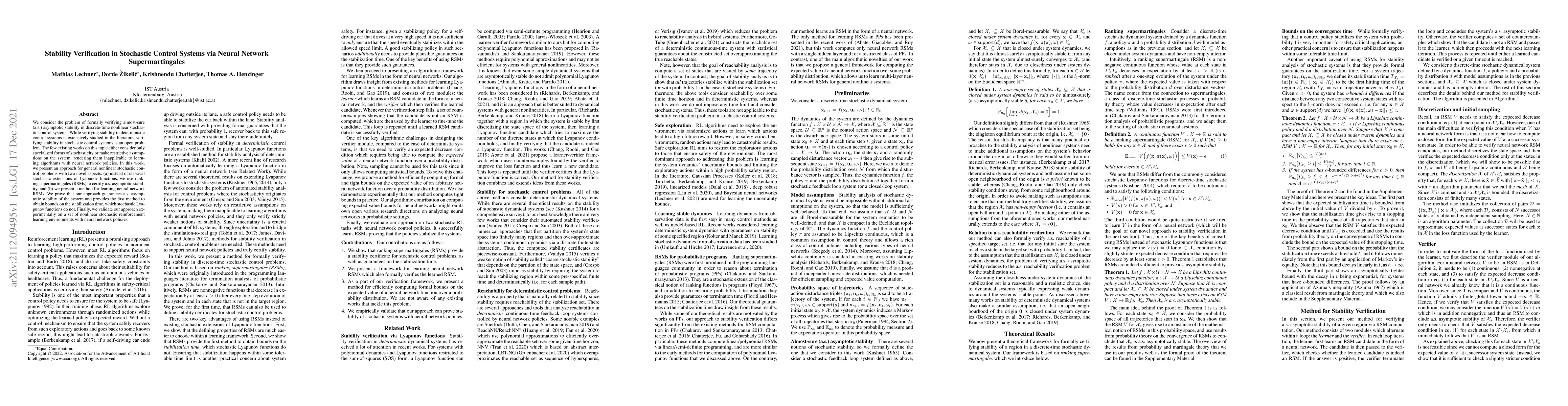 This paper proposes a novel method for verifying almost-sure asymptotic stability in discrete-time nonlinear stochastic control systems using ranking supermartingales (RSMs) and neural networks. The approach provides a general solution applicable to learning algorithms and offers bounds on stabilization time, which traditional stochastic Lyapunov functions cannot.