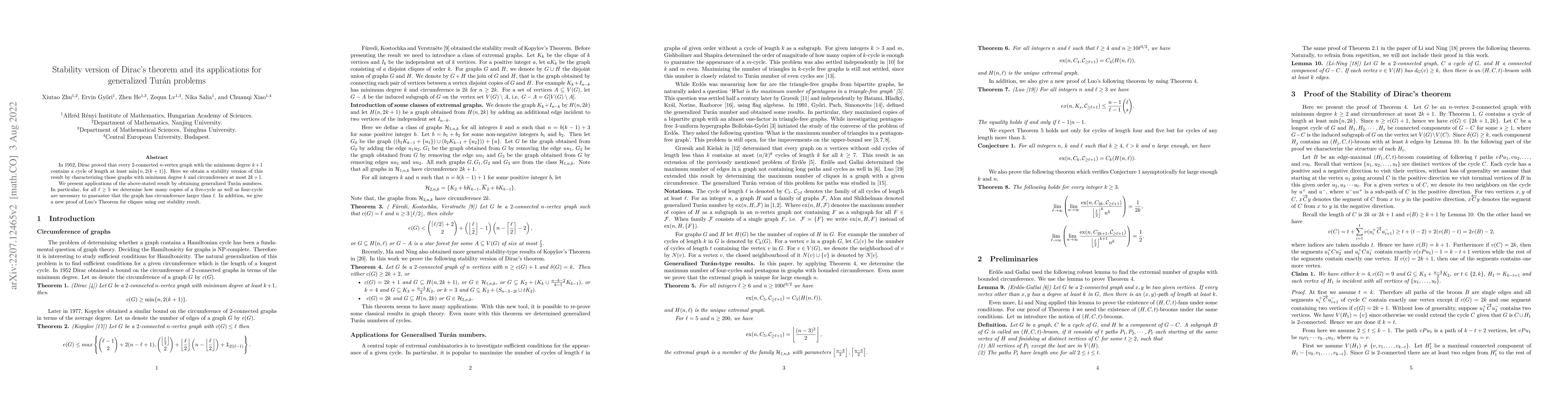 Summary: This paper presents a stability version of Dirac's theorem, characterizing graphs with minimum degree $k$ and small circumference, and applies this result to determine generalized Turán numbers for cycles, including new proofs for Luo's Theorem on cliques.