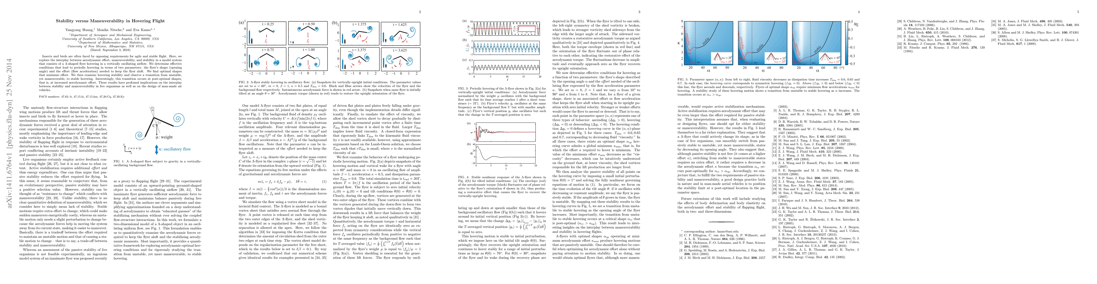 Insects and birds are often faced by opposing requirements for agile and stable flight. Here, we explore the interplay between aerodynamic effort, maneuverability, and stability in a model system that consists of a $\Lambda$-shaped flyer hovering in a vertically oscillating airflow. We determine effective conditions that lead to periodic hovering in terms of two parameters: the flyer's shape (opening angle) and the effort (flow acceleration) needed to keep the flyer aloft. We find optimal shapes that minimize effort. We then examine hovering stability and observe a transition from unstable, yet maneuverable, to stable hovering. Interestingly, this transition occurs at post-optimal shapes, that is, at increased aerodynamic effort. These results have profound implications on the interplay between stability and maneuverability in live organisms as well as on the design of man-made air vehicles.