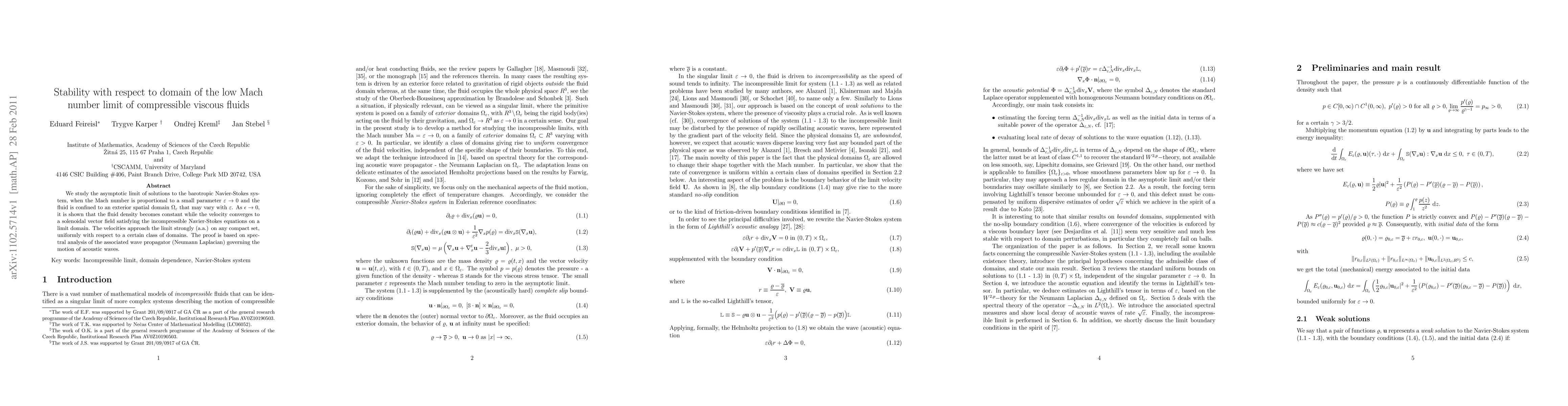 We study the asymptotic limit of solutions to the barotropic Navier-Stokes system, when the Mach number is proportional to a small parameter $\ep \to 0$ and the fluid is confined to an exterior spatial domain $\Omega_\ep$ that may vary with $\ep$. As $\epsilon \rightarrow 0$, it is shown that the fluid density becomes constant while the velocity converges to a solenoidal vector field satisfying the incompressible Navier-Stokes equations on a limit domain. The velocities approach the limit strongly (a.a.) on any compact set, uniformly with respect to a certain class of domains. The proof is based on spectral analysis of the associated wave propagator (Neumann Laplacian) governing the motion of acoustic waves.