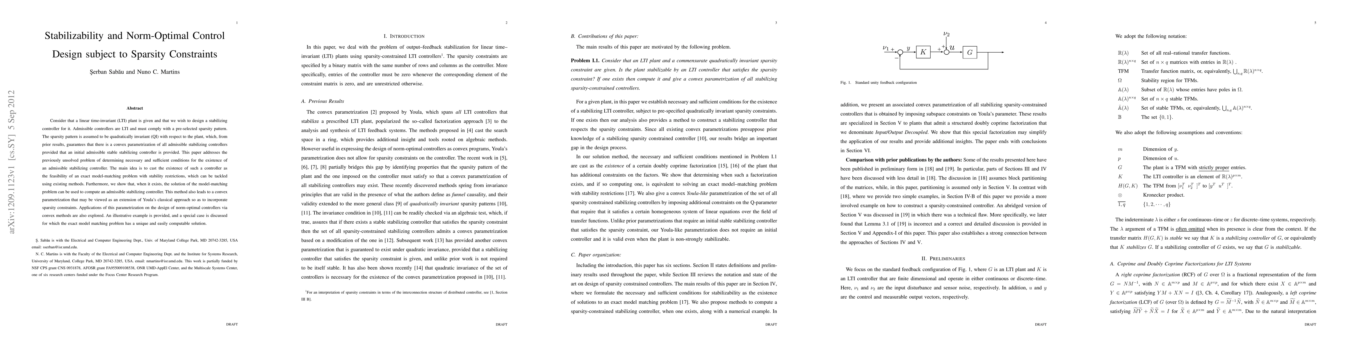 Consider that a linear time-invariant (LTI) plant is given and that we wish to design a stabilizing controller for it. Admissible controllers are LTI and must comply with a pre-selected sparsity pattern. The sparsity pattern is assumed to be quadratically invariant (QI) with respect to the plant, which, from prior results, guarantees that there is a convex parametrization of all admissible stabilizing controllers provided that an initial admissible stable stabilizing controller is provided. This paper addresses the previously unsolved problem of determining necessary and sufficient conditions for the existence of an admissible stabilizing controller. The main idea is to cast the existence of such a controller as the feasibility of an exact model-matching problem with stability restrictions, which can be tackled using existing methods. Furthermore, we show that, when it exists, the solution of the model-matching problem can be used to compute an admissible stabilizing controller. This method also leads to a convex parametrization that may be viewed as an extension of Youla's classical approach so as to incorporate sparsity constraints. Applications of this parametrization on the design of norm-optimal controllers via convex methods are also explored. An illustrative example is provided, and a special case is discussed for which the exact model matching problem has a unique and easily computable solution.