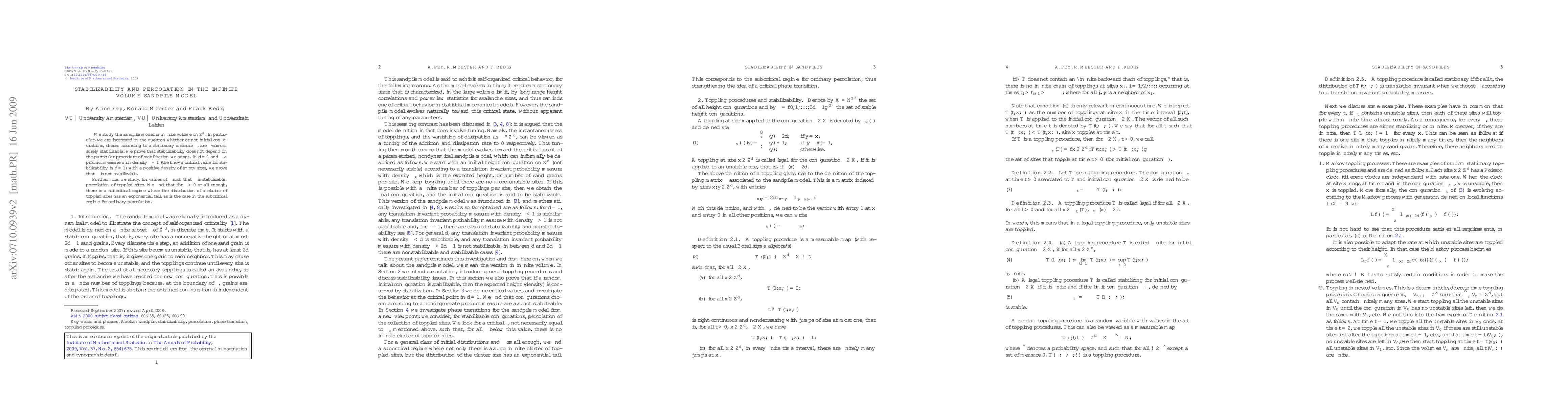 This paper investigates the infinite volume sandpile model on $\mathbb{Z}^d$, proving that stabilizability is independent of the stabilization method. It finds that for $d=1$ and $\rho=1$, the critical density for stabilizability, configurations are not stabilizable when there is a positive density of empty sites. It also examines percolation of toppled sites, showing that for small $\rho>0$, clusters of toppled sites exhibit an exponential tail, akin to subcritical ordinary percolation.